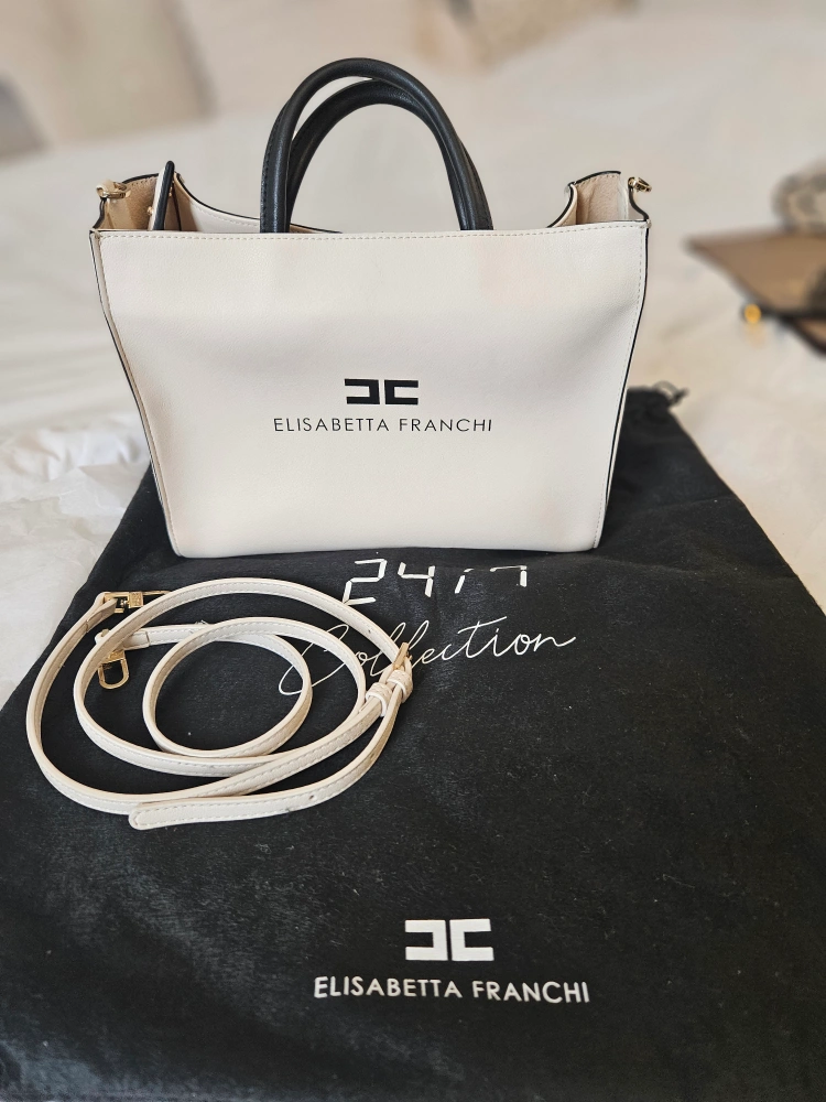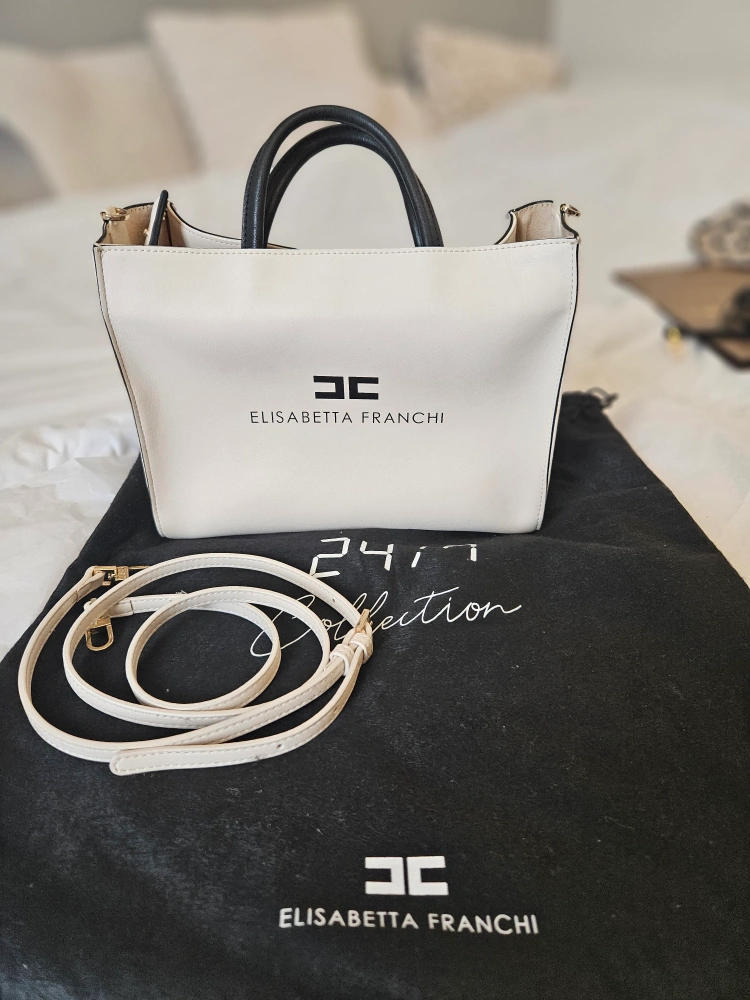 Selling an Elisabetta Franchi handbag in a lovely white and black colour combination! It comes with a shoulder strap and a dust bag. There are some signs of use inside, please see pictures! All items are final sale