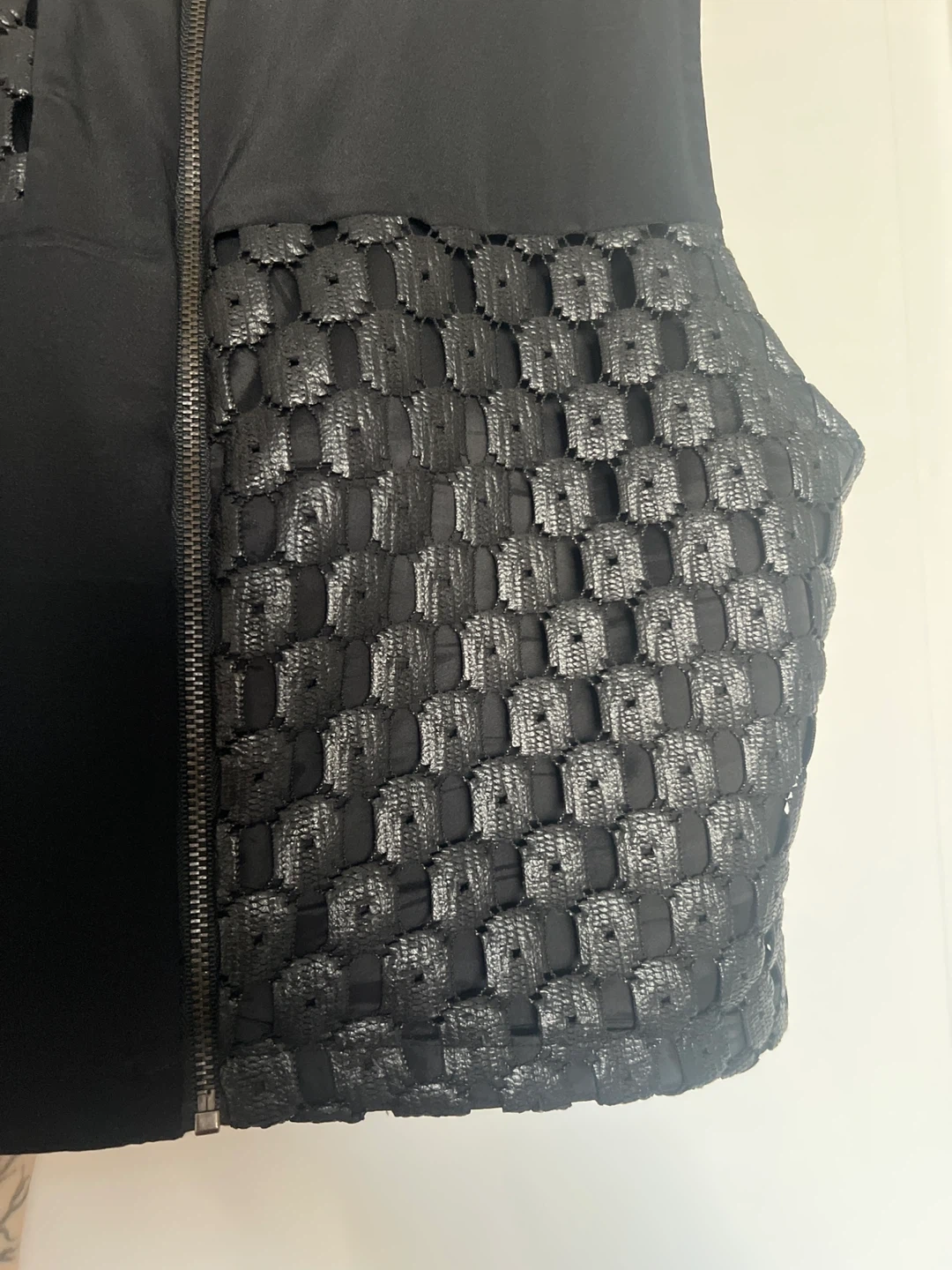 Navy deep blue silk and intricate woven panel zip up sleeveless crop blouse. this brand is no longer in operation, which makes this piece of rare find. available for pick up near St. Lawrence Market