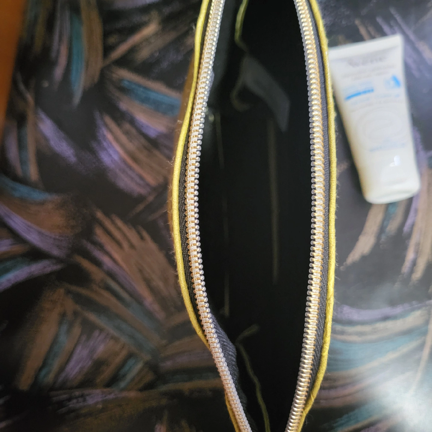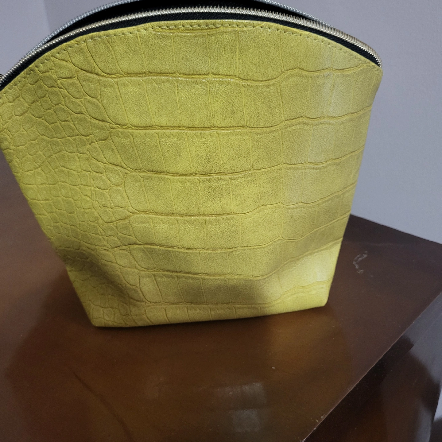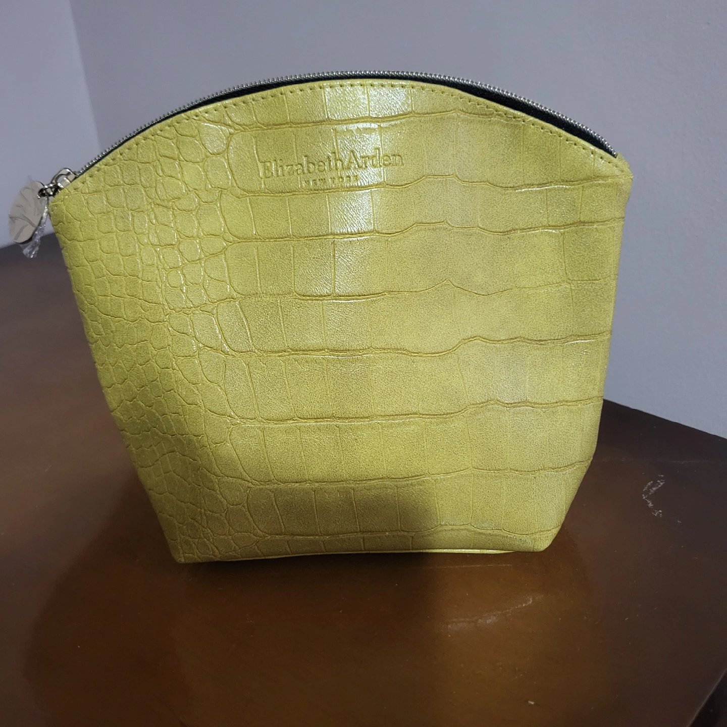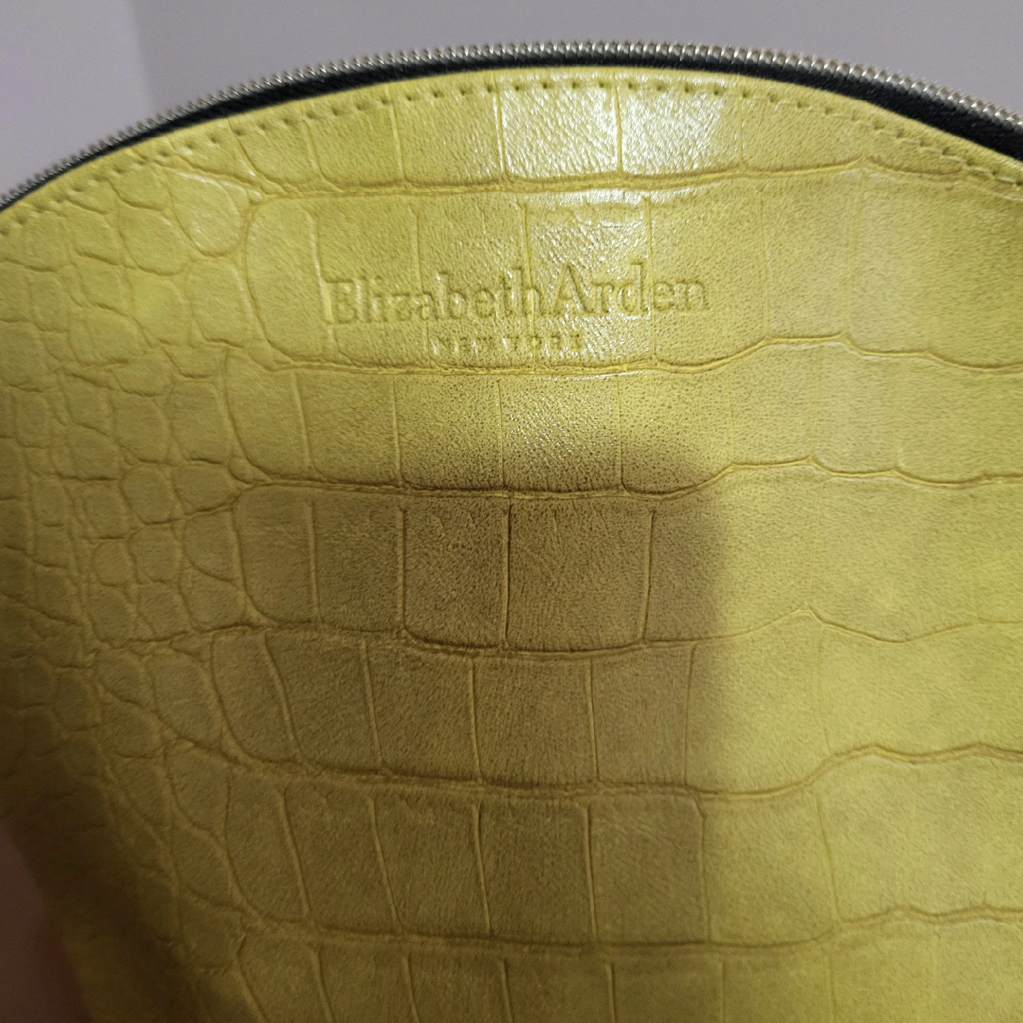 A cute Elizabeth Arden cosmetic bag in a bright yellow colour! It has a faux crocodile skin texture and a zipper closure. Perfect for storing your makeup or skincare essentials