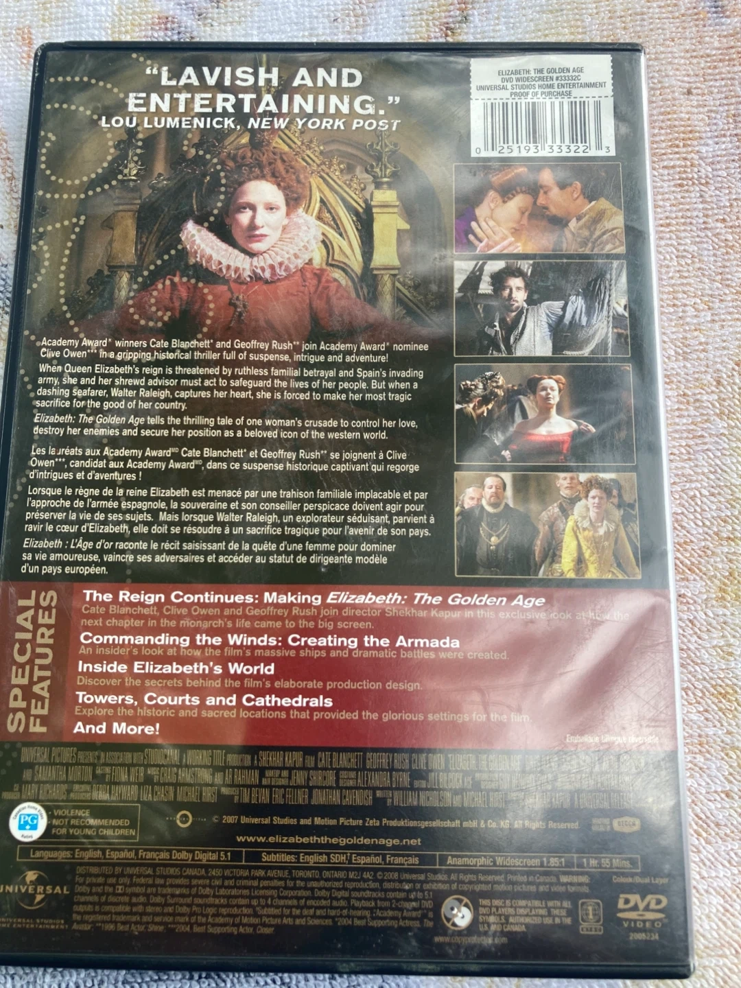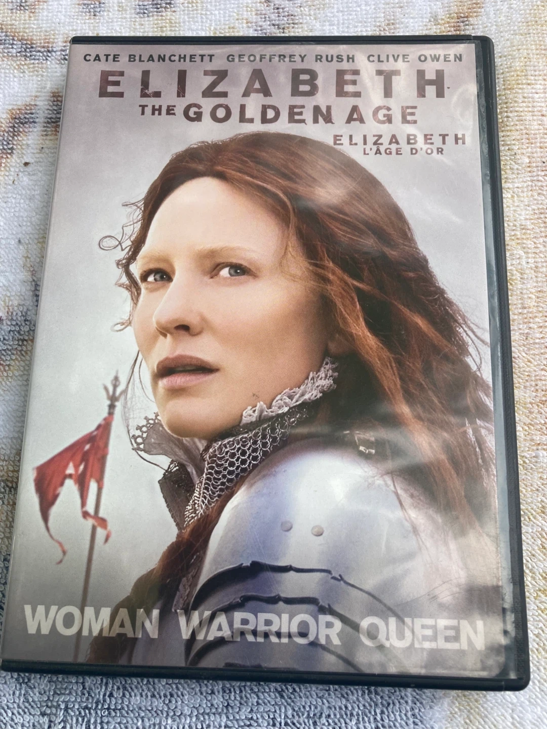 Selling Elizabeth: The Golden Age on DVD, starring Cate Blanchett, Geoffrey Rush, and Clive Owen! It's a historical thriller about Queen Elizabeth and her struggle to protect her throne. The DVD includes special features like 'Commanding the Winds: Creating the Armada' and 'Inside Elizabeth's World'. A great addition to any film collection