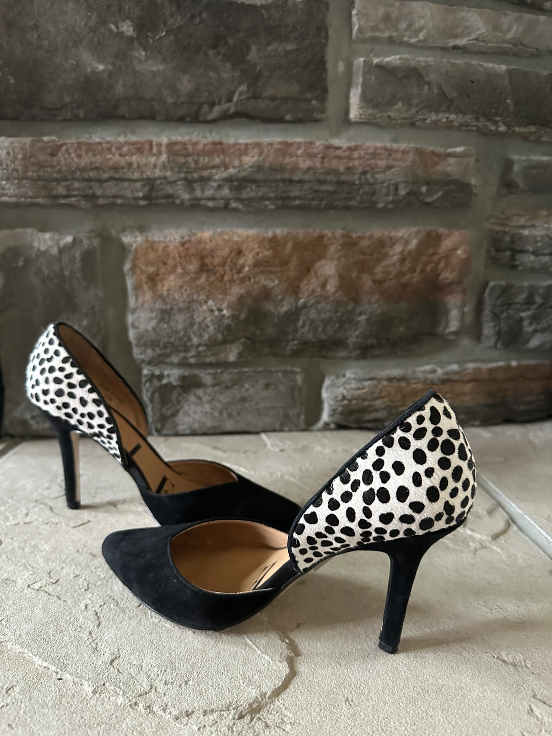 Black suede heels with a white and black spotted design. The heels are approximately 3.5 inches high. They have some pealing from inside but it’s not visible.