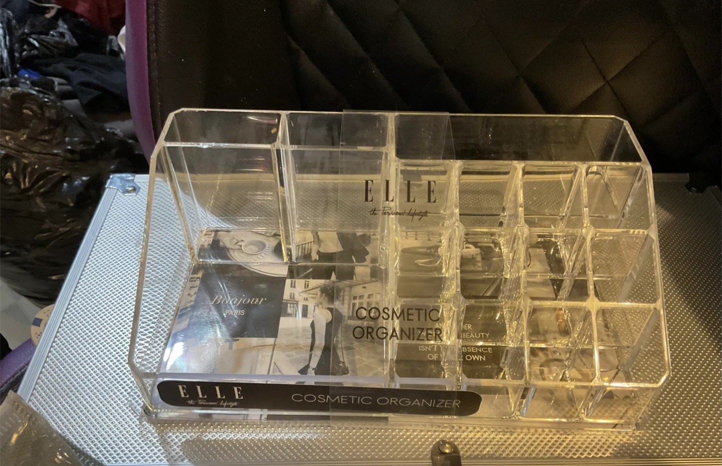 Selling a clear cosmetic organizer from ELLE. It's perfect for keeping all your makeup and beauty products neatly organized and easily accessible. It has multiple compartments to store different sized items. A stylish and functional addition to any vanity or bathroom!