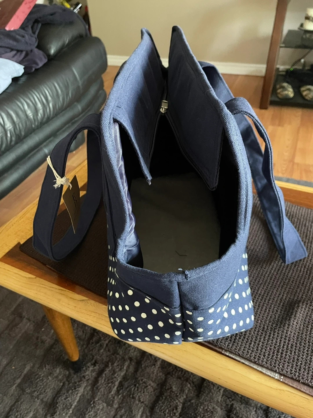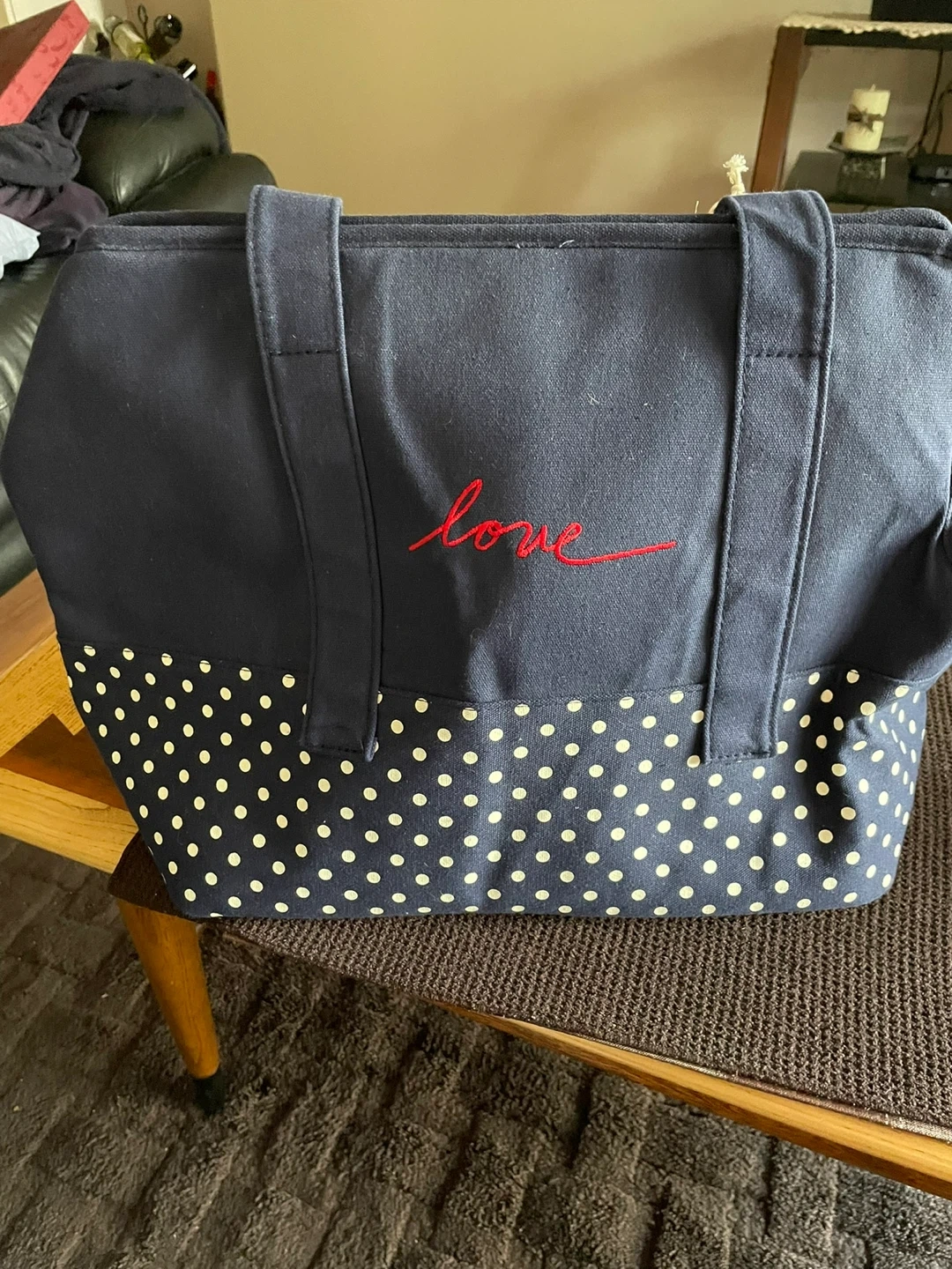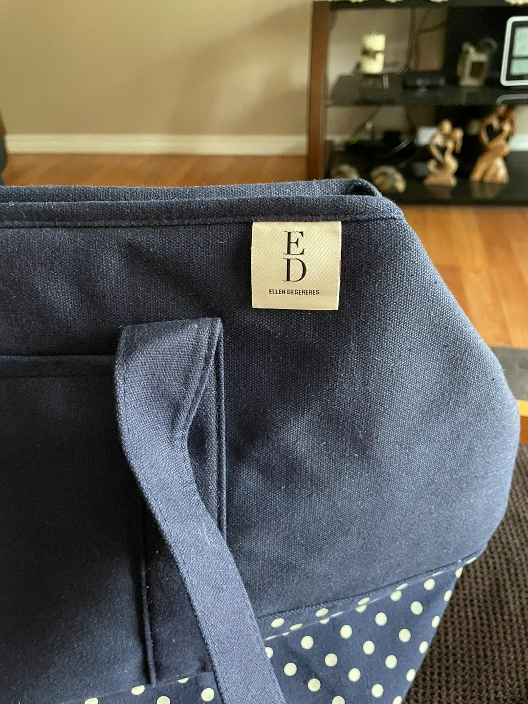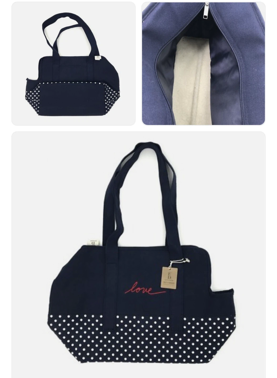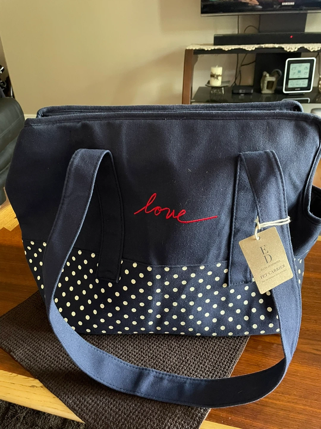 This is a cute Ellen DeGeneres pet carrier in navy blue with white polka dots. It has the word 'love' embroidered on the side. Perfect for taking your furry friend on the go!