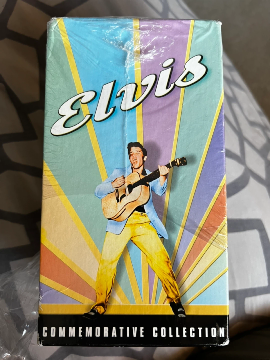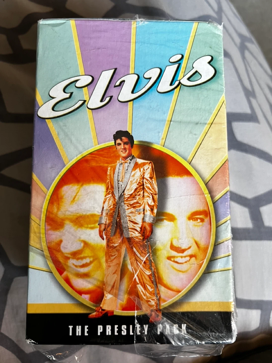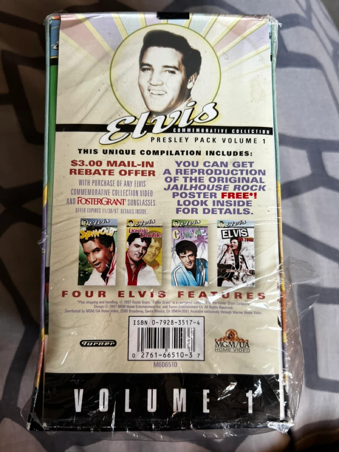 Selling a commemorative collection of Elvis Presley Pack Volume 1 on VHS! This unique compilation includes a reproduction of the original Jailhouse Rock poster. It also features four Elvis movies: Spinout, Double Trouble, Clambake, and Elvis On Tour