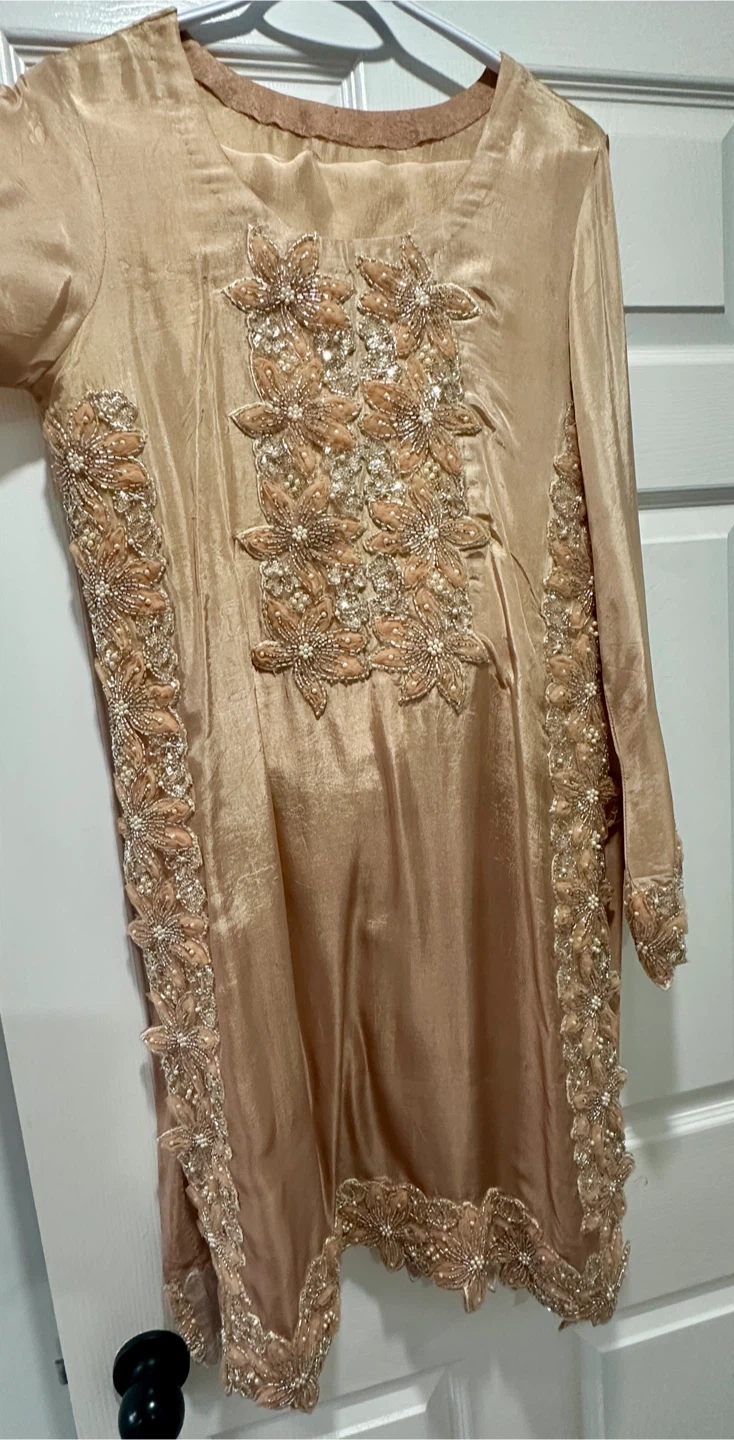 Beautiful farshi salwar suit with intricate embroidery! The fabric has a lovely sheen, and the floral beadwork is really eye-catching. Perfect for a special occasion or just to add a bit of elegance to your wardrobe
