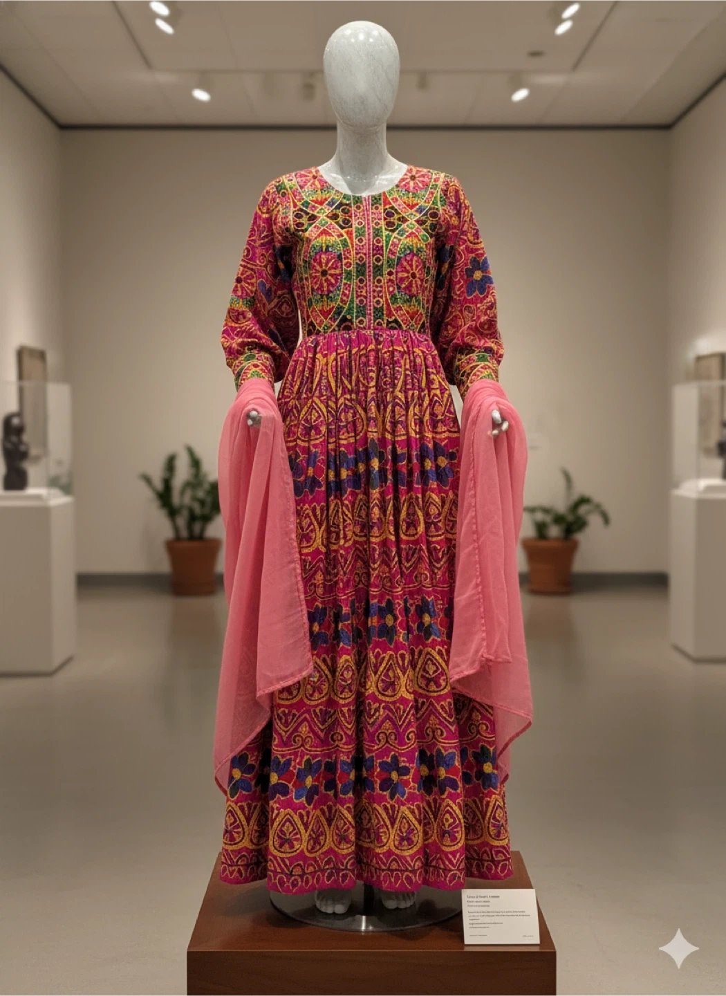 This is a beautifully embroidered dress with a matching shawl. The dress features vibrant colours and intricate detailing. It would be perfect for a special occasion or as a unique addition to your wardrobe