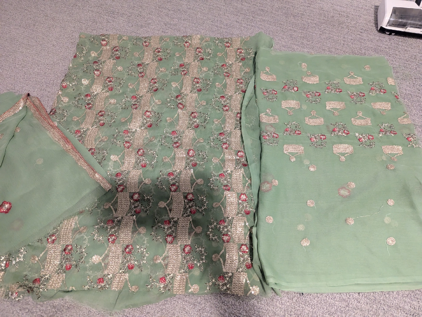 Beautiful mint green salwar kameez suit with intricate embroidery. The fabric has a lovely sheen and the embroidery adds a touch of elegance. Perfect for special occasions or festive gatherings!