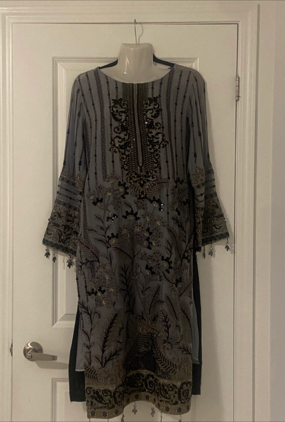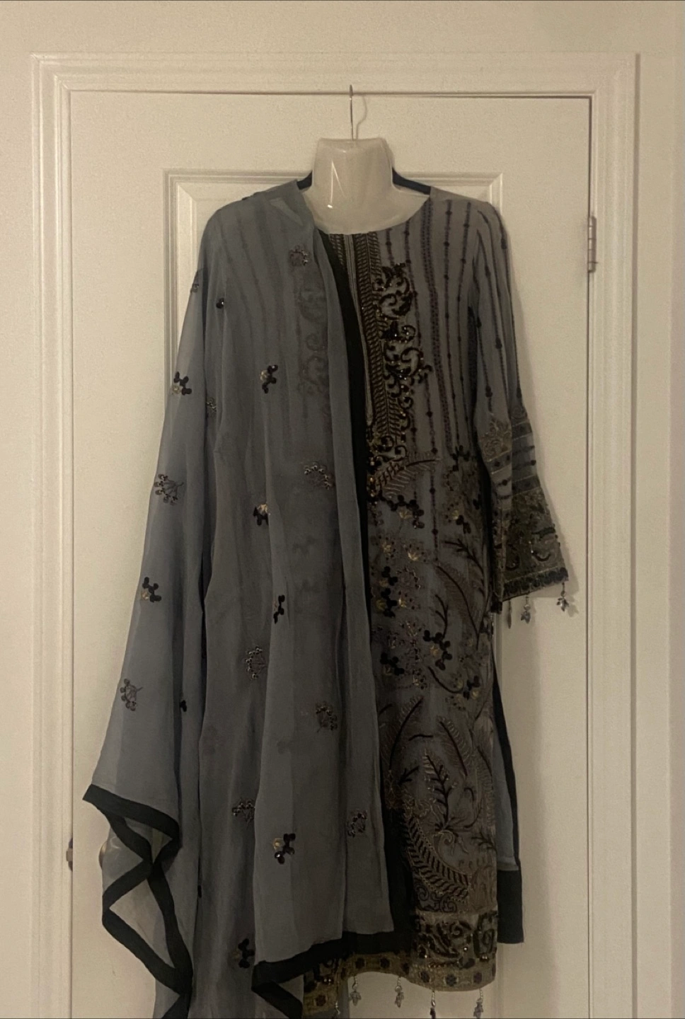 Beautifully embroidered shalwar kameez in a lovely grey colour. Perfect for a special occasion or just feeling a bit fancy! Comes with a matching dupatta.