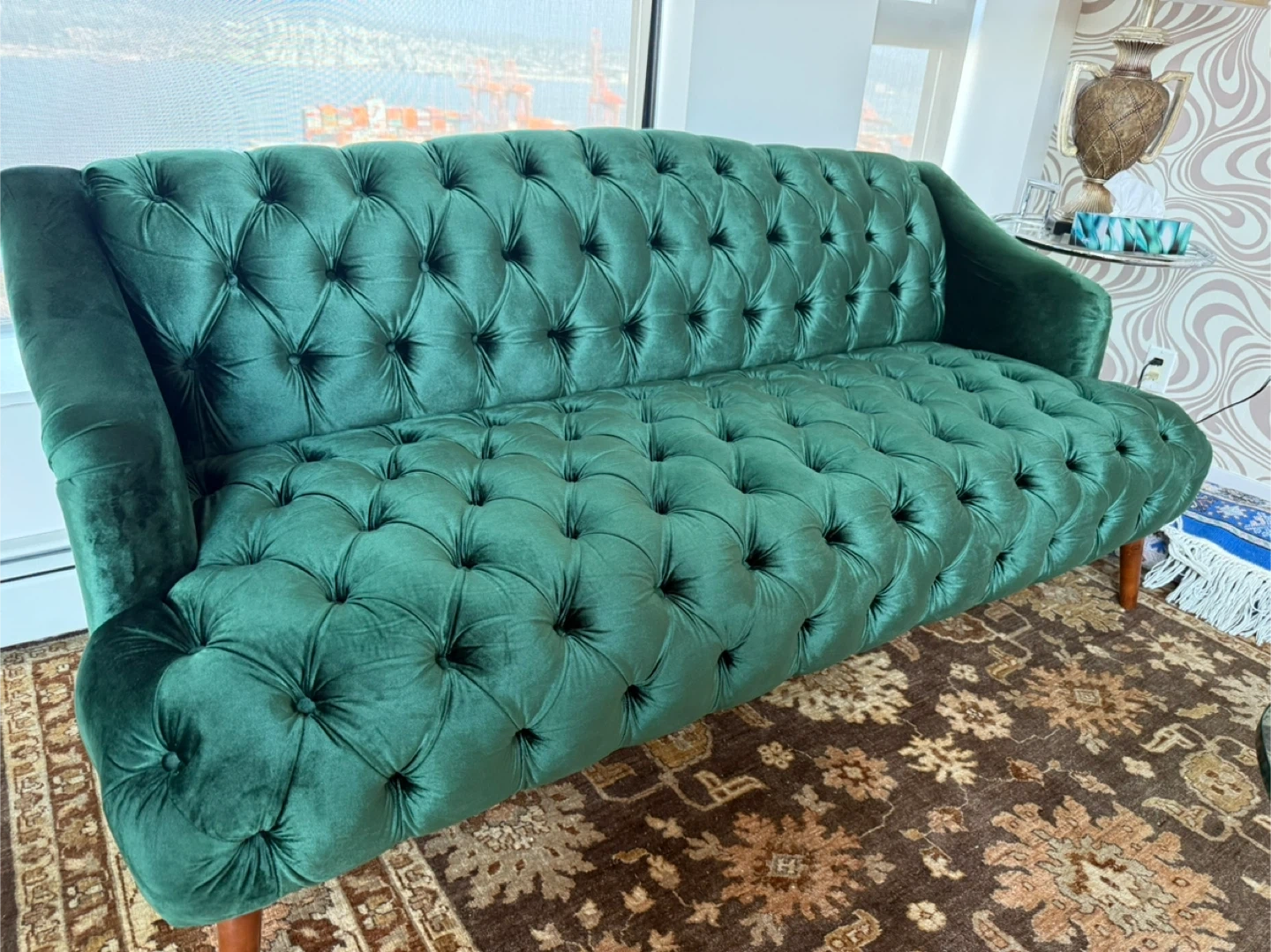 Selling a beautiful emerald green tufted sofa. It's in great condition and would look lovely in any living room or den. The tufted design adds a touch of elegance and comfort. If you are interested send me a message!