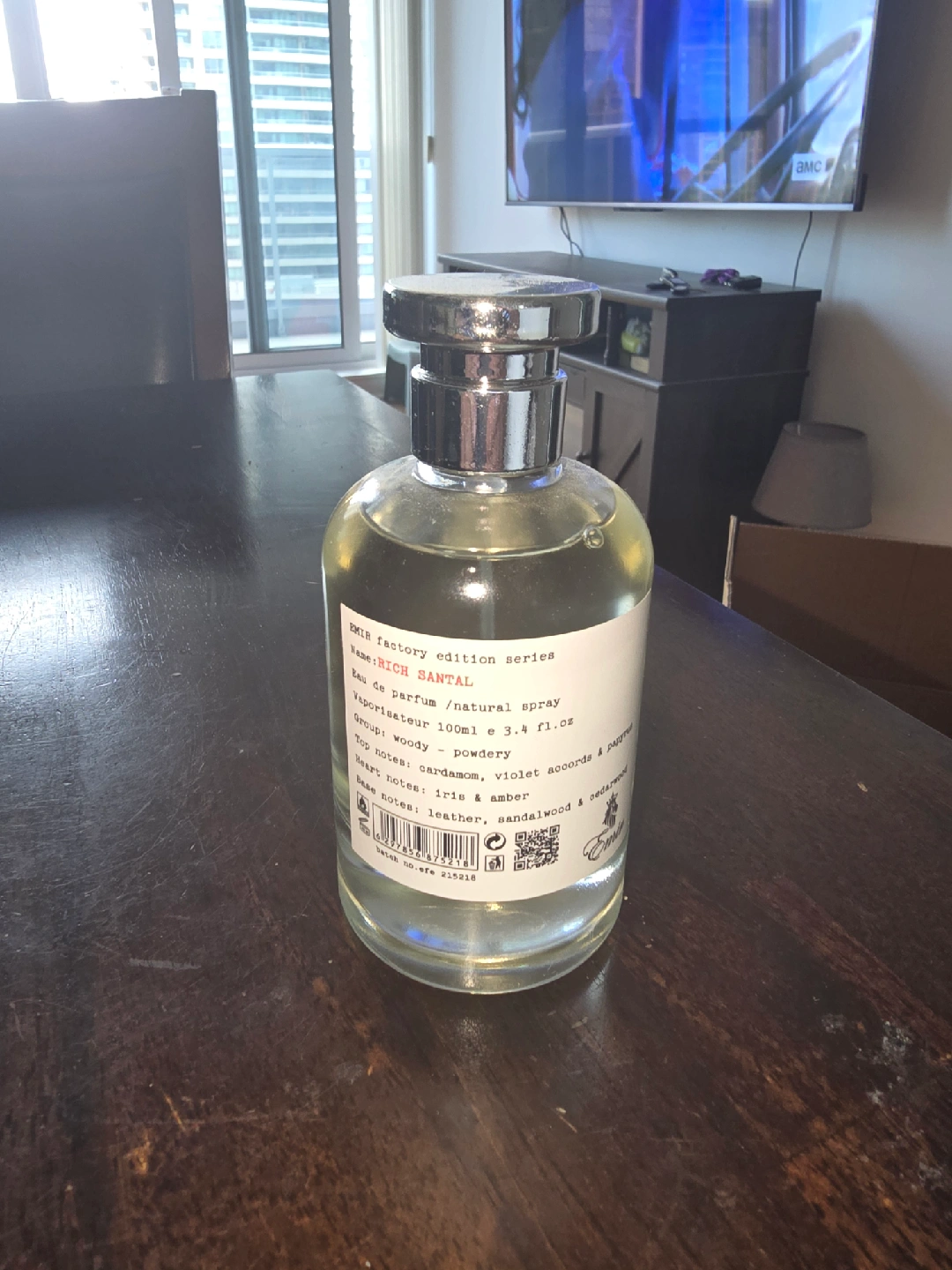 Selling a bottle of Emir Rich Santal perfume from the Factory Edition series. It's an eau de parfum with a natural spray, containing 100ml (3.4 fl.oz). The scent is a woody and powdery fragrance, featuring top notes of cardamom and violet accords, heart notes of iris and amber, and base notes of leather, sandalwood, and cedarwood