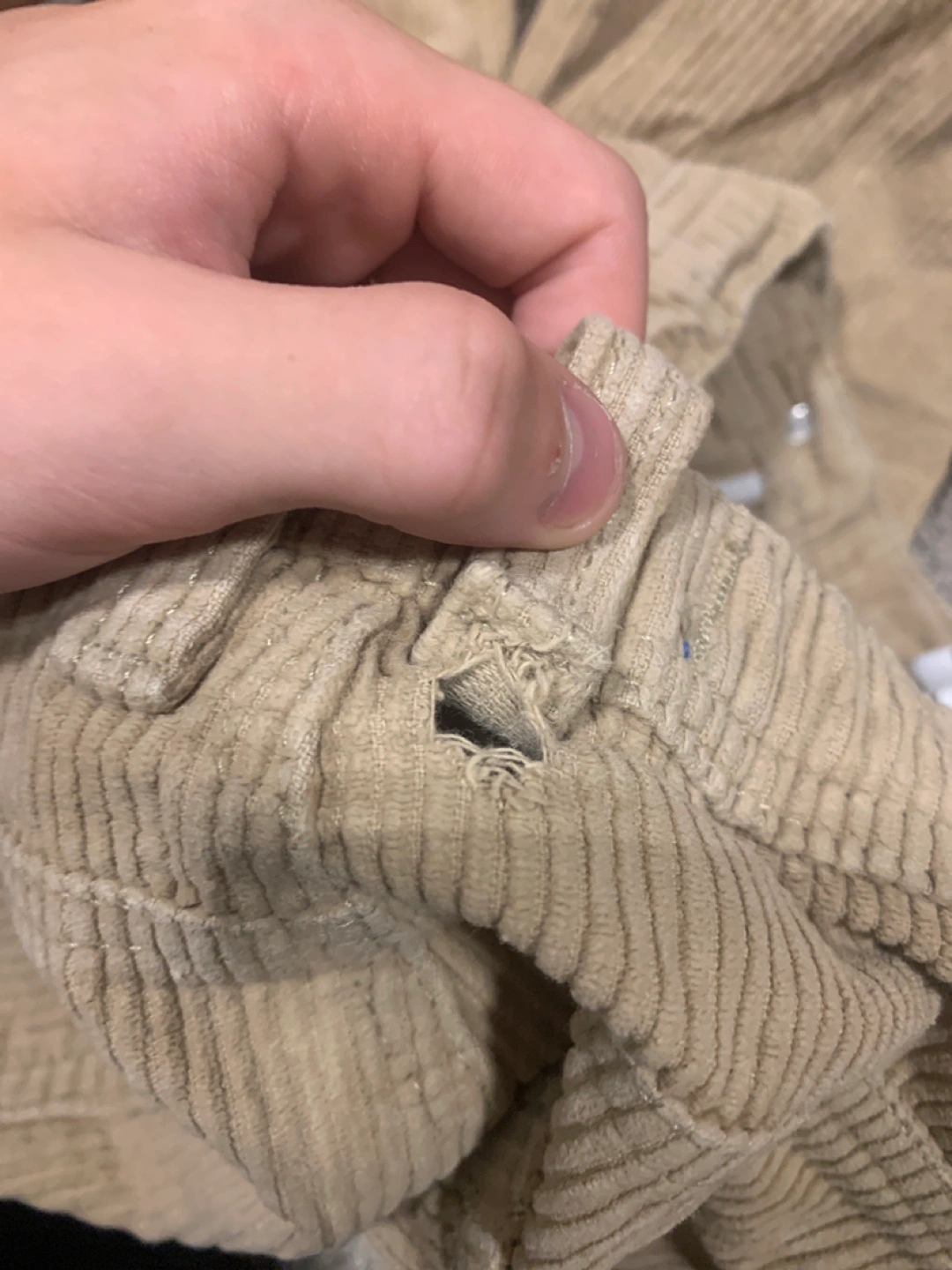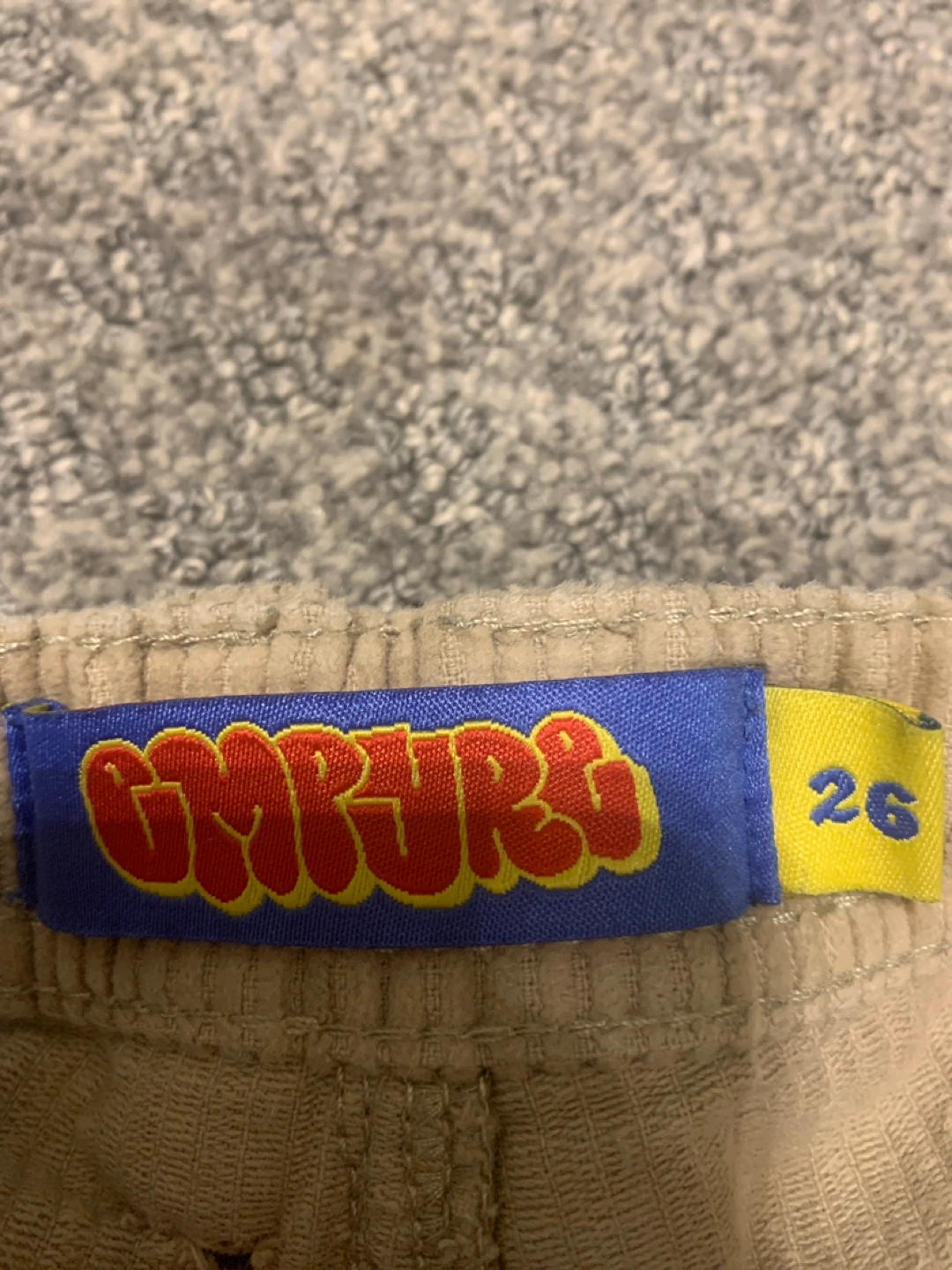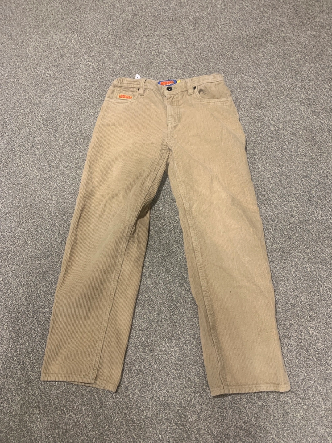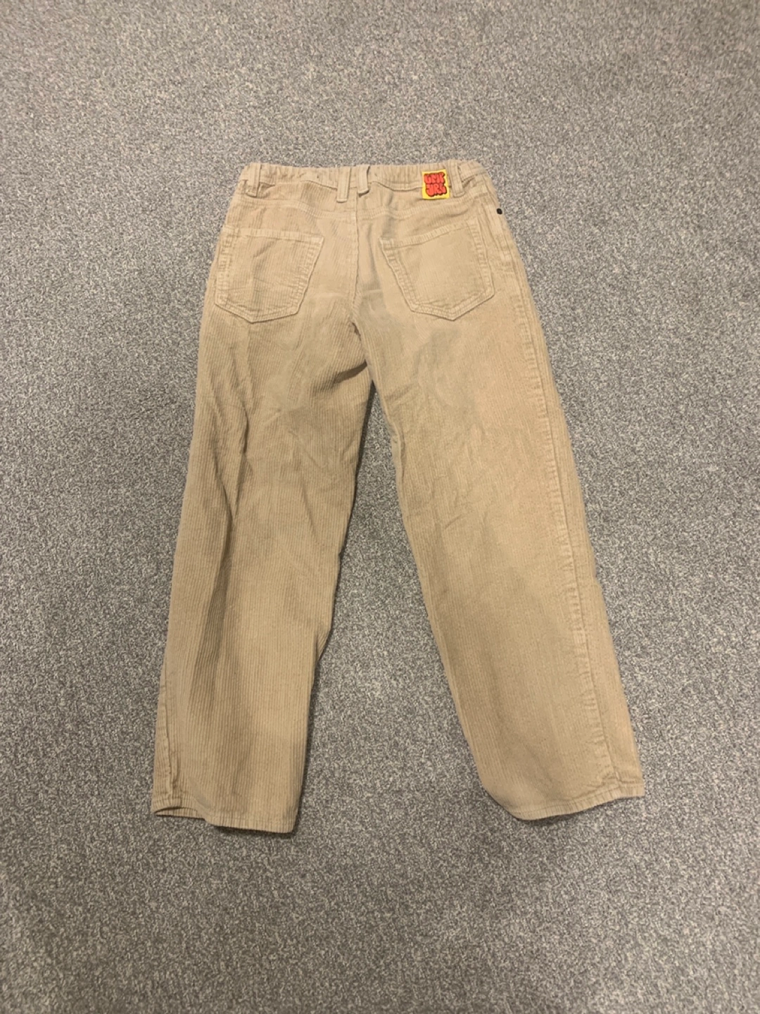Selling a pair of empire corduroy pants in size 26. They're a stylish, neutral colour, perfect for everyday wear. Please note there is a small hole near the button, as shown in the photos.
