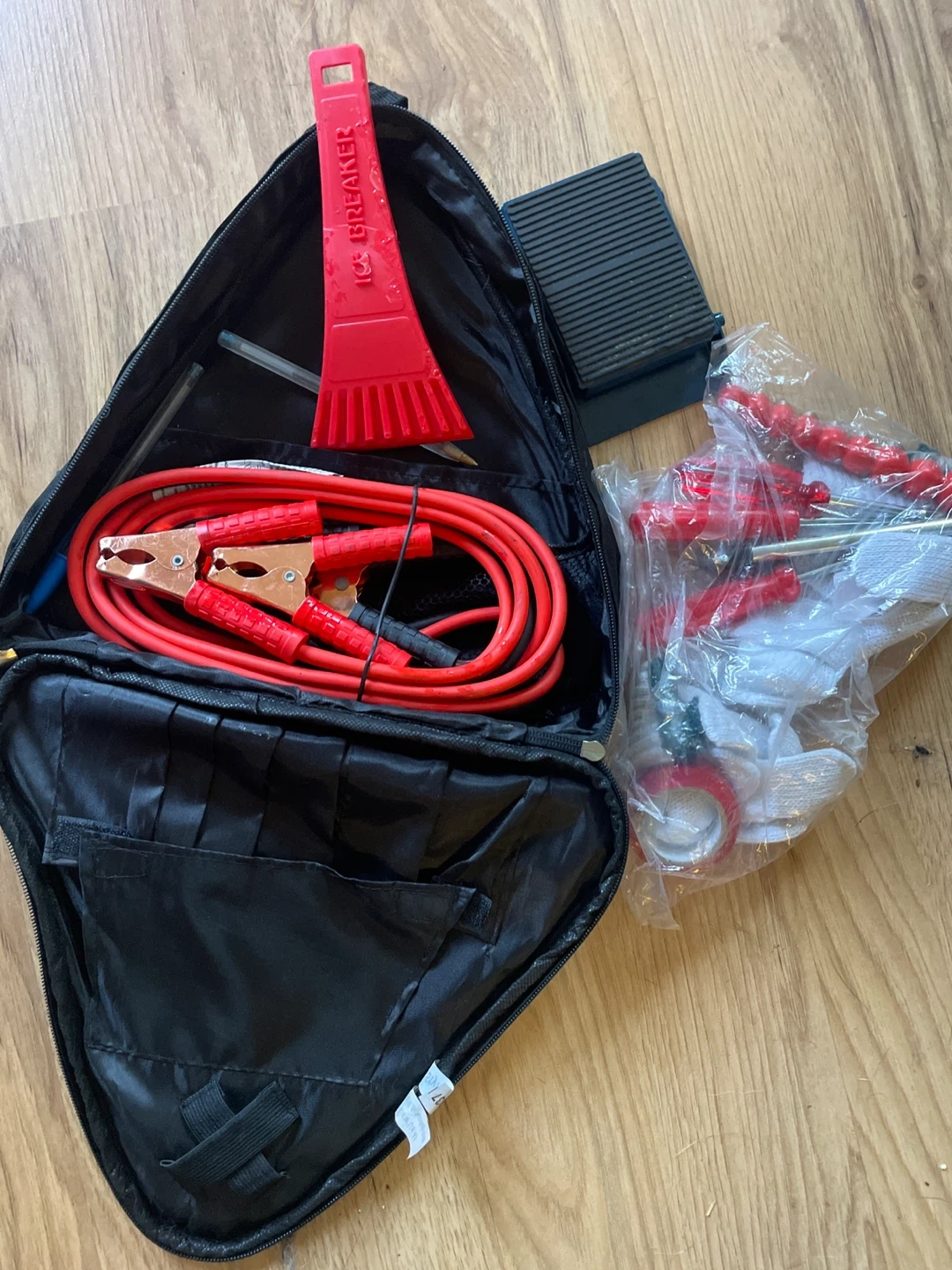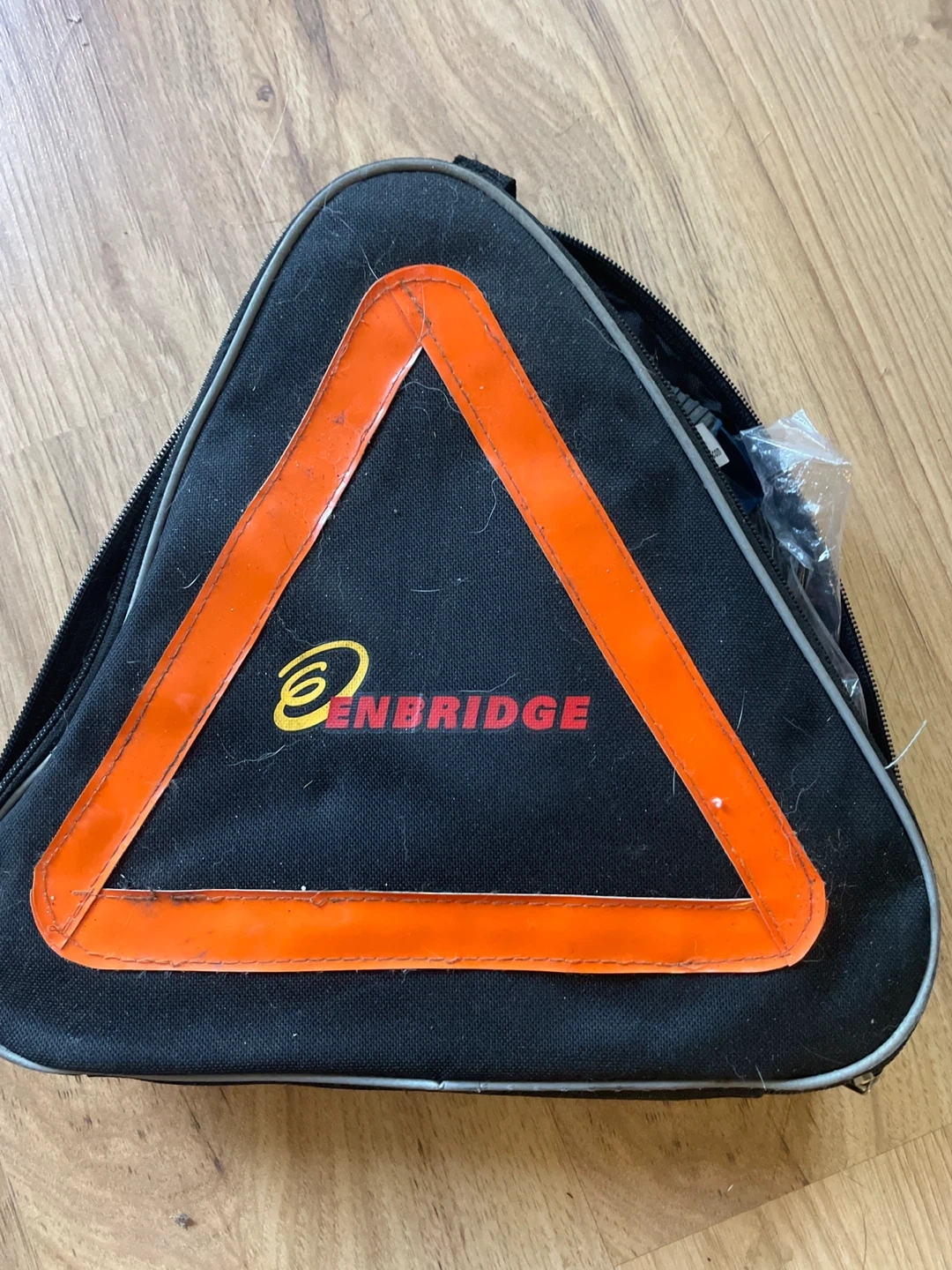 Selling an Enbridge car emergency kit. It comes in a convenient triangular carrying case. Inside, you'll find jumper cables, a breaker ice scraper, and other essential tools for roadside situations