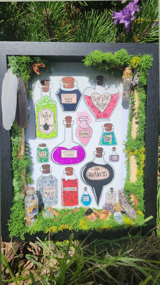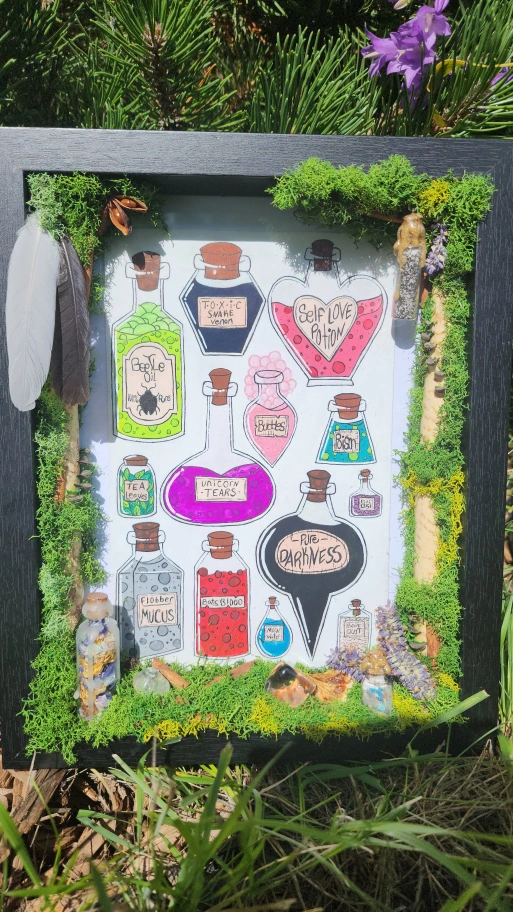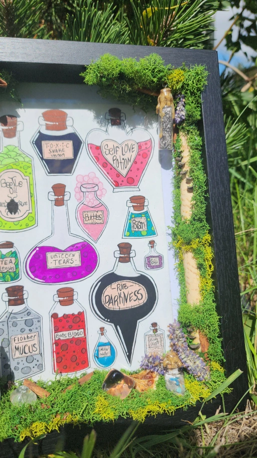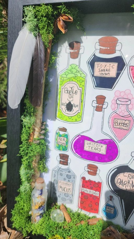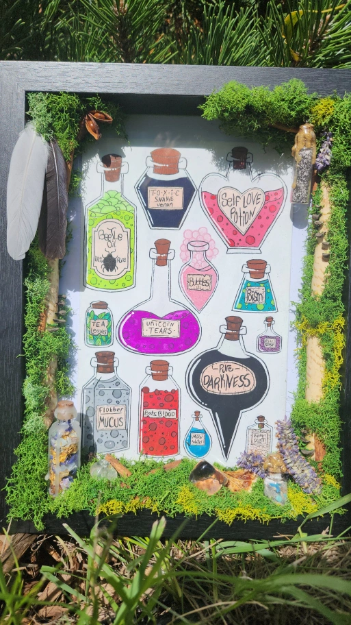 Elevate your space with this one-of-a-kind, handcrafted artwork, featuring vibrant, hand-painted potion bottles rendered in rich gouache. Framed with lush, locally foraged moss and adorned with natural treasures, this piece exudes a magical, fantasy-inspired charm that transforms any room into a realm of wonder. Why You’ll Love It: Unique & Handmade: Each detail is meticulously crafted, ensuring no two pieces are alike. Whimsical Aesthetic: Perfect for fantasy lovers, witches, or anyone seeking a touch of enchantment. Nature-Inspired: Thoughtfully adorned with elements like moss, feathers, and dried botanicals, all sustainably foraged from the wilds of Saskatchewan. Crystal Energy: Infused with amethyst and clear quartz for a touch of mystical allure. Materials List (all locally sourced in Saskatchewan): • Lush moss • Delicate feathers • Fragrant cinnamon sticks • Star anise pods • Soothing lavender sprigs • Rustic pinecone pieces • Vibrant dried orange slice • Sparkling amethyst and clear quartz crystals • Three potion bottles filled with a curated blend of herbs and crystals Perfect For: • Fantasy-themed decor • Unique gift for art collectors or nature enthusiasts • Adding a magical focal point to your home or office. 65$ Pick up preferred but delivery is available for a fee.