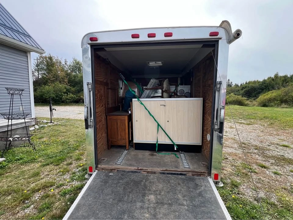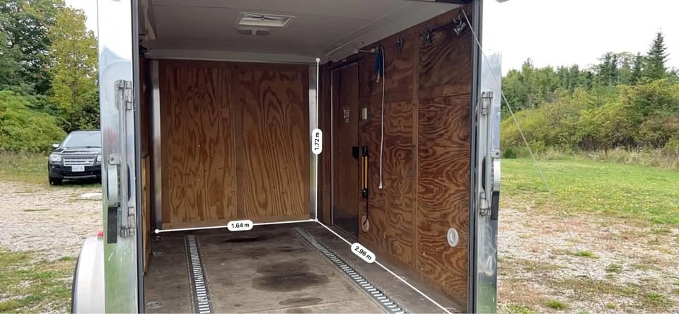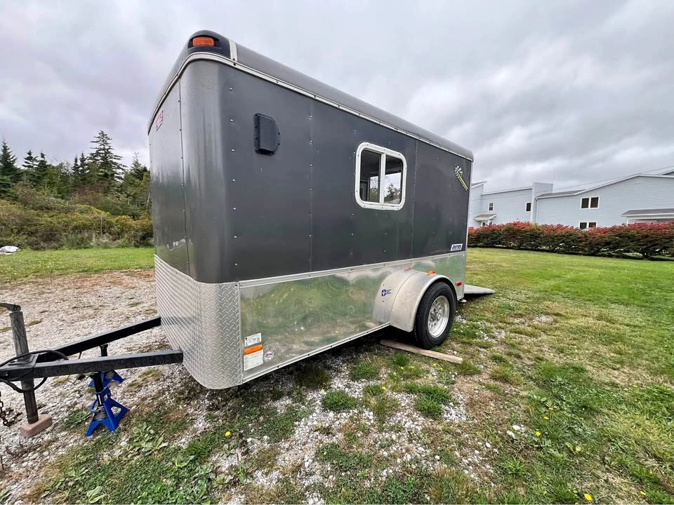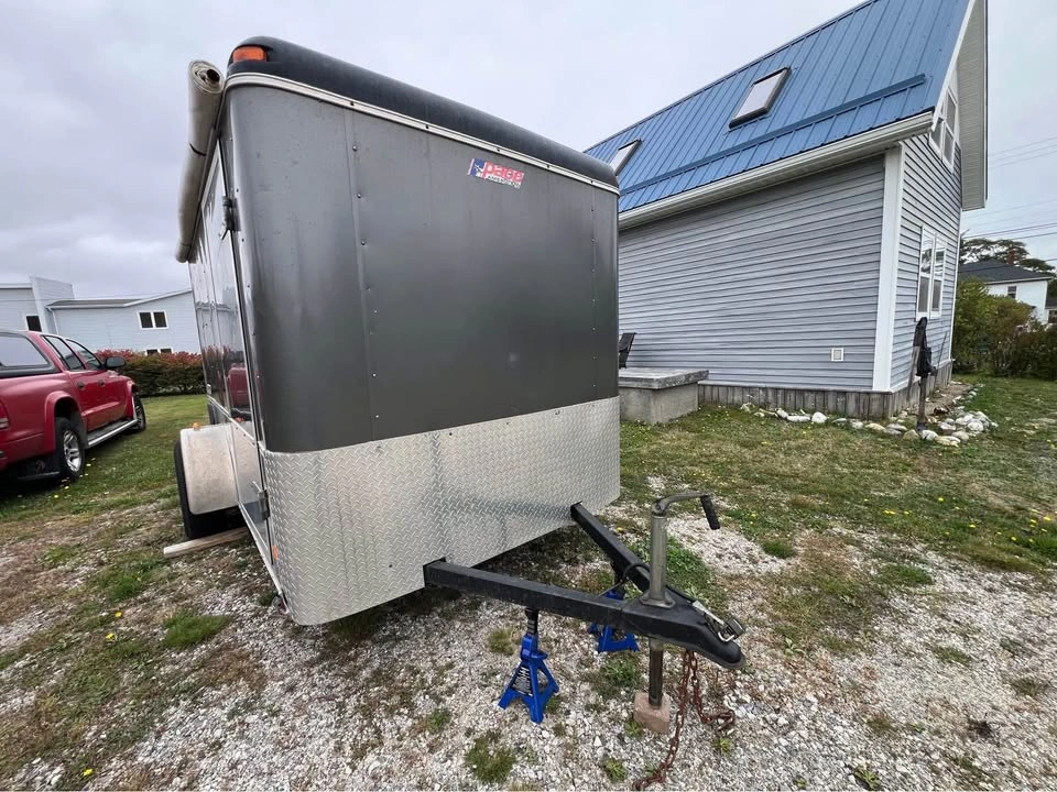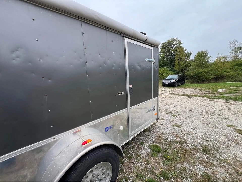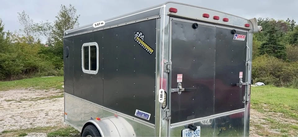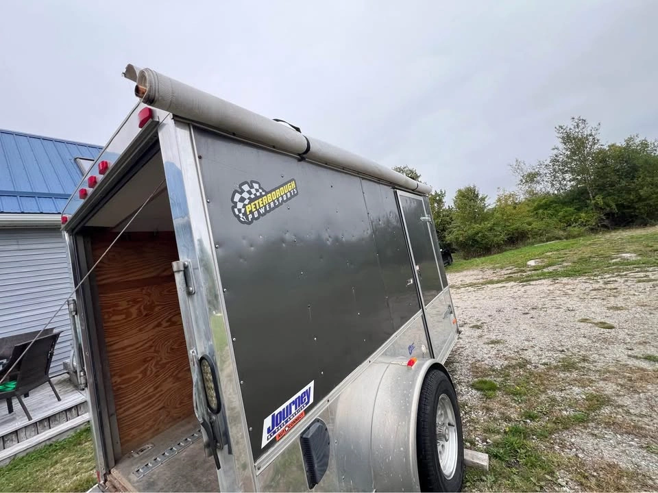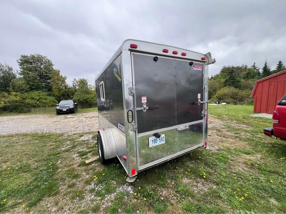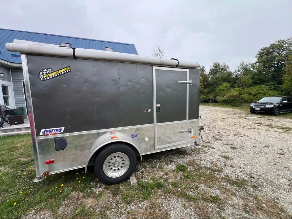 Pace American Performance Enclosed Trailer with ramp and side door and window Brand: Journey by Pace American Special tracks and hooks for securing ATVs and Motorbikes Wired for external power Skylight on roof Extra wide single axle with aluminum rims and 15” wheels, threads are still in good health Payload max 1710.0lbs 5-way flat plug External dims 10’ x 6’ x 6’ Internal dims 9’7” x 5’6” x 5’4” Rear ramp door Side door Pull out table inside trailer Awning Roll-out attached to right side of the trailer Aluminum body and skirt One side window Vent on one side Independent Torsion suspension Ontario trailer comes with Ontario ownership