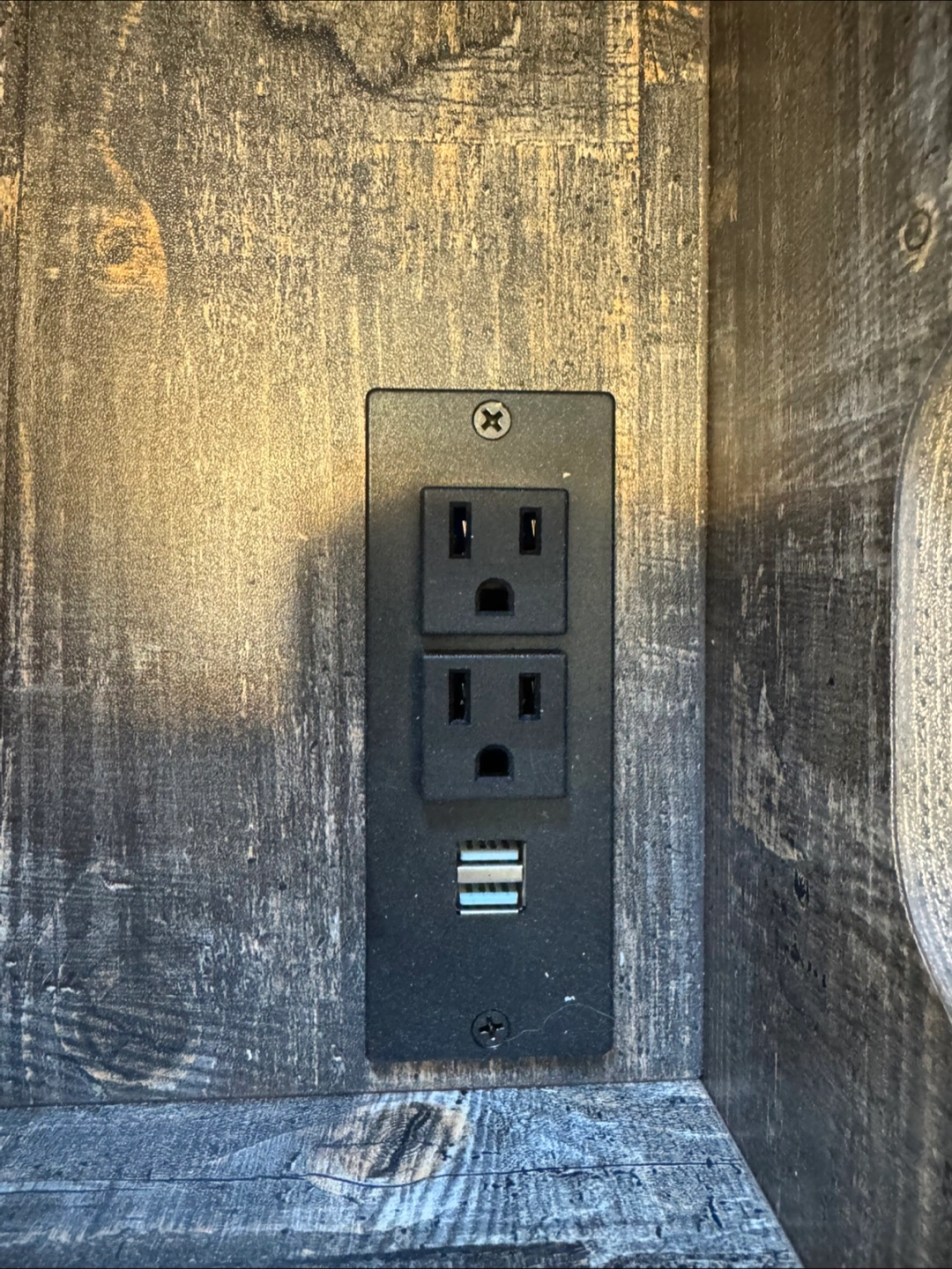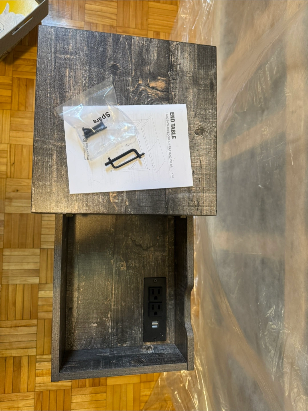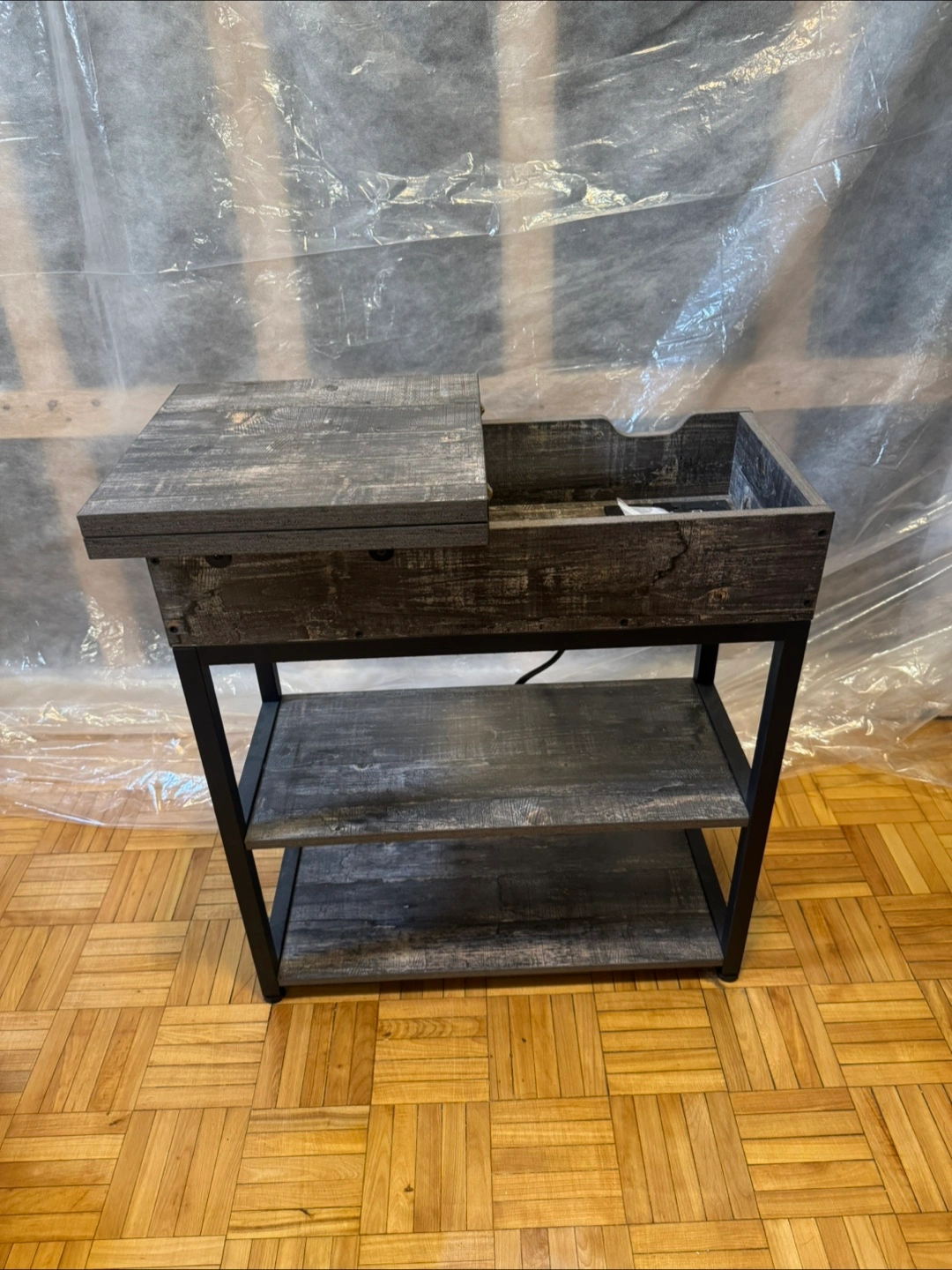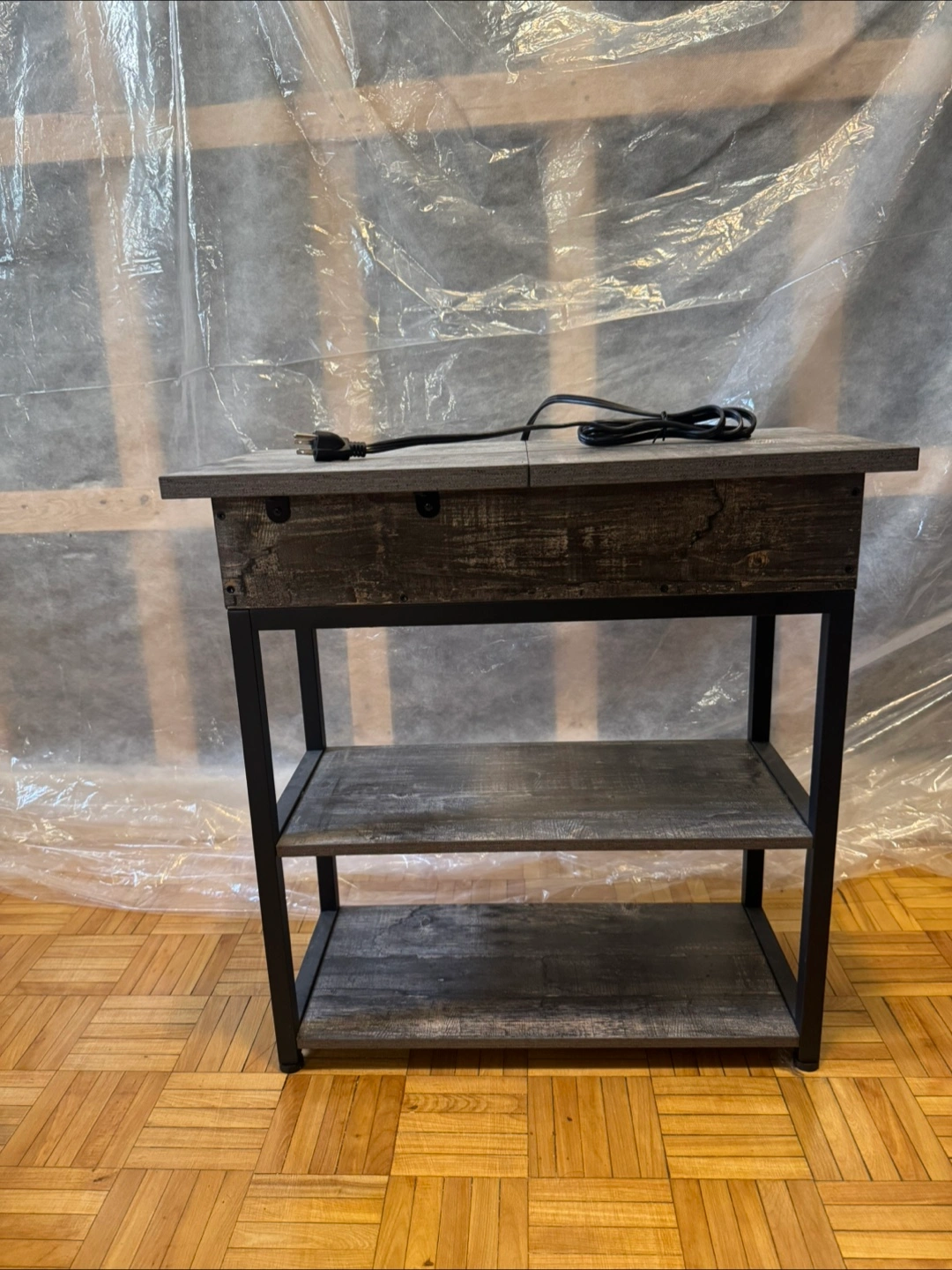 End table with a rustic wood finish and black metal frame Only had for a few years Features: - Built-in power outlets - USB ports for charging your devices - Two shelves for storage or display - Slide out top Perfect for bedside or living room use Top 23”5/8 L 11”3/4W Inside compartment 20”L 8”3/8W 3”3/8D Middle shelf 19”1/2L (21”1/4L with legs) 9”3/8W 8”1/4H Bottom shelf 19”1/2L (21”1/4L with legs) 9”3/8W 8”H Overall height 2ft