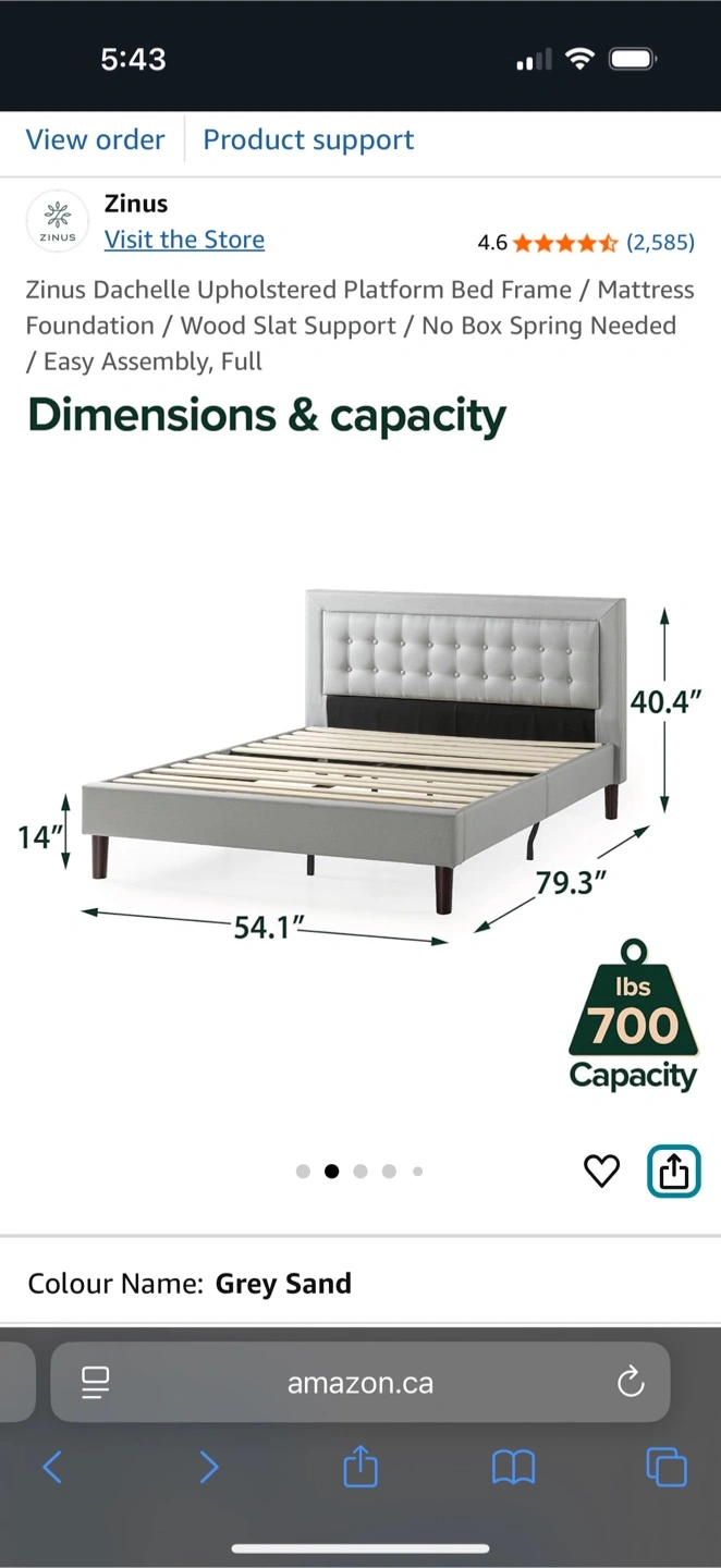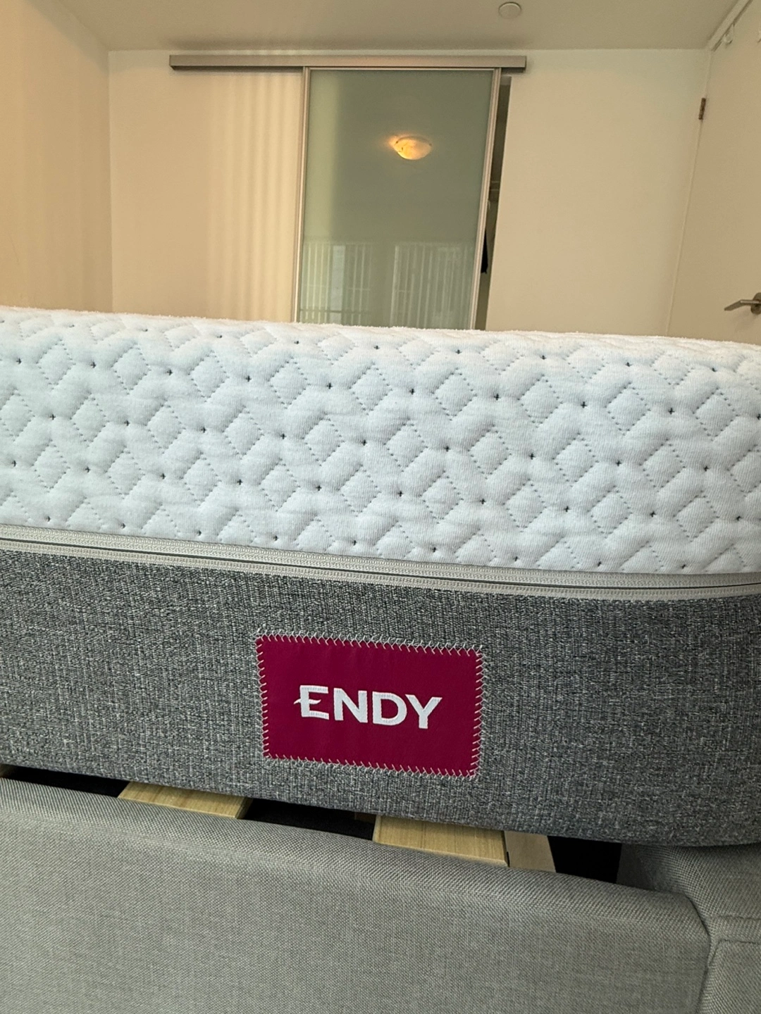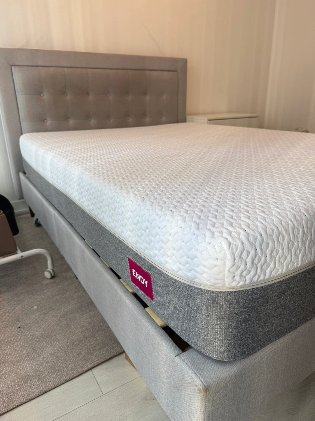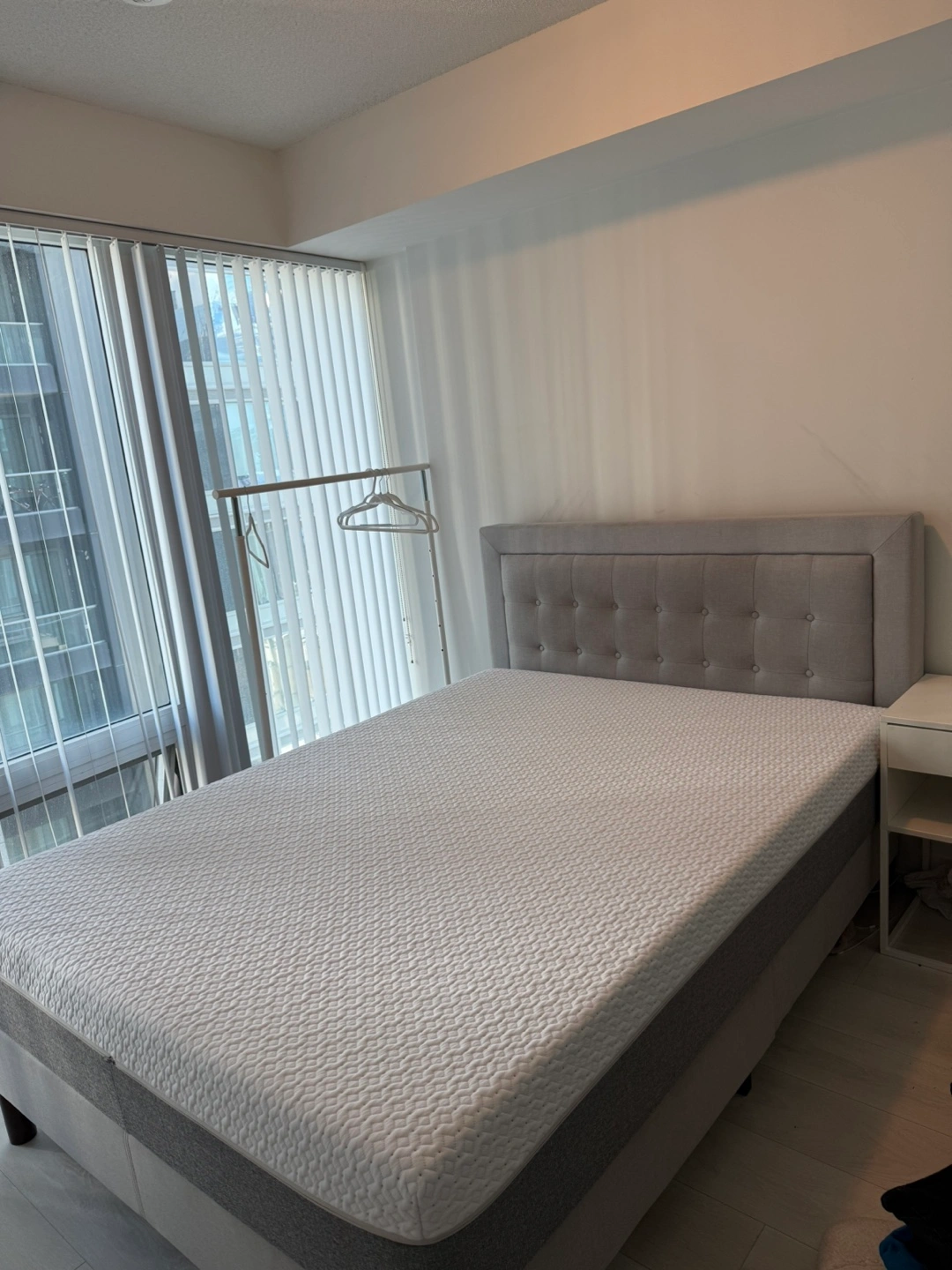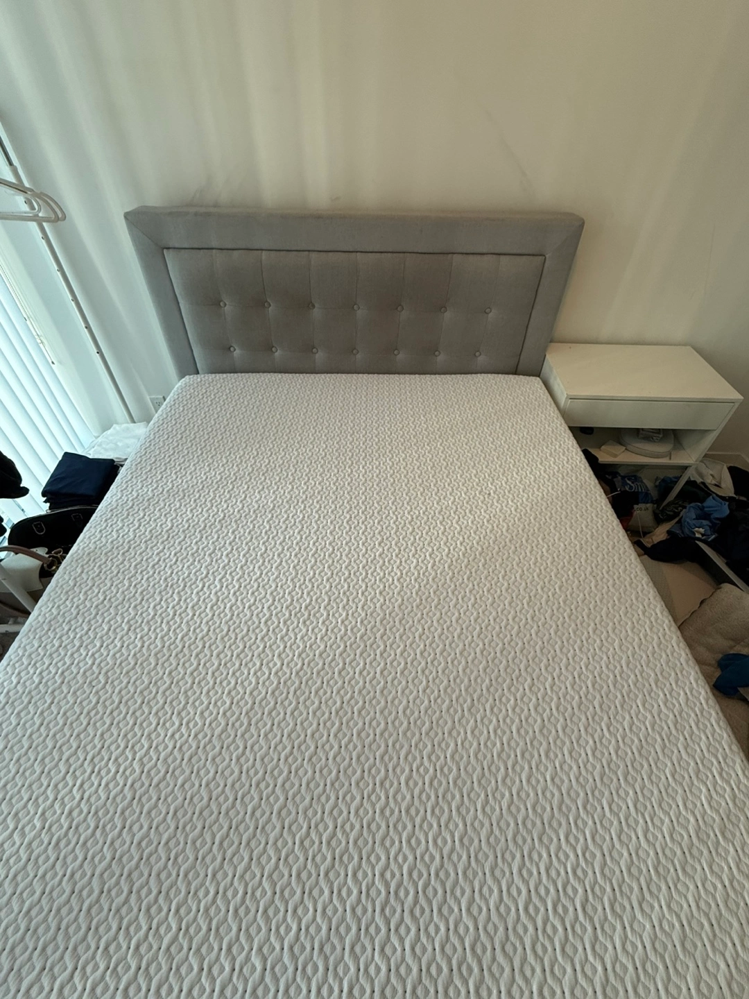 Full/Double size Endy mattress with grey fabric headboard and frame used in a smoke free, pet free home. Mattress is medium-firm and in excellent condition, no stains. Dimensions of the frame is included in pictures. Selling because I’m moving out, pick up only, downtown Toronto.