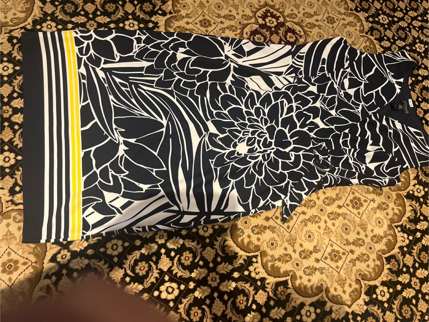 This is an Enfocus Studio dress in size 14. It features a navy and white floral pattern. It would be a great addition to your wardrobe. Never wore it but removed the tags.