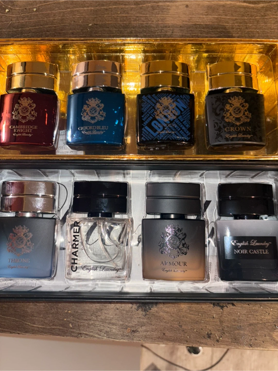 Selling an English Laundry cologne collection gift set. The set includes eight different fragrances: Cambridge Knight, Oxford Bleu, London, Crown, Throne, Charmer, Armour, and Noir Castle. Great for trying out different scents or as a gift! Value 139$ shoppers has them on sale for half 79$ both for 60