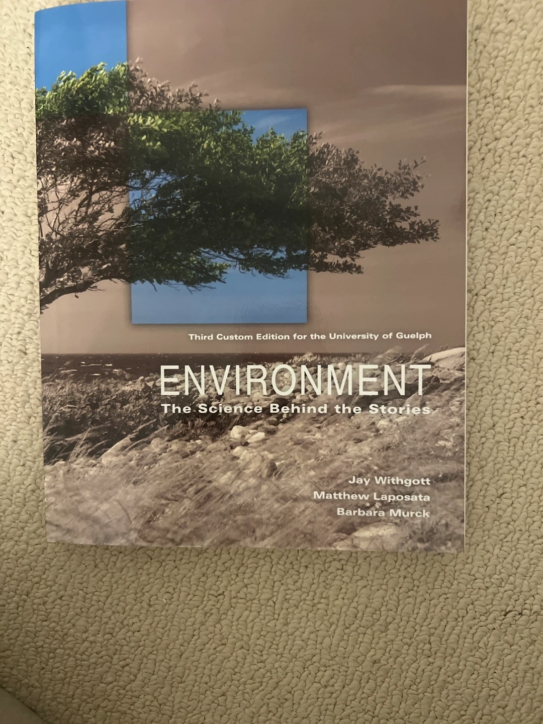 Selling a copy of "Environment: The Science Behind the Stories," Third Custom Edition for the University of Guelph. Authored by Jay Withgott, Matthew Laposata, and Barbara Murck. Perfect for students at Guelph!
