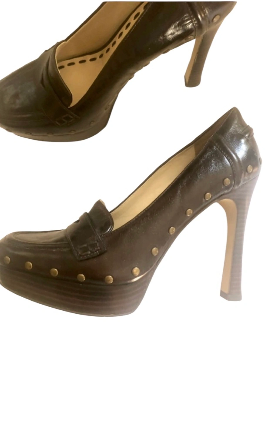 These are a pair of Enzo Angiolini heeled shoes . They are brown leather with gold hardware. They have a platform and a heel. Size 8