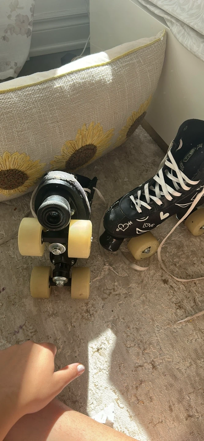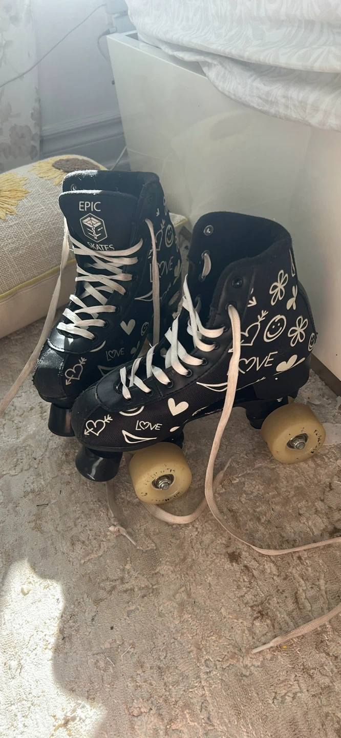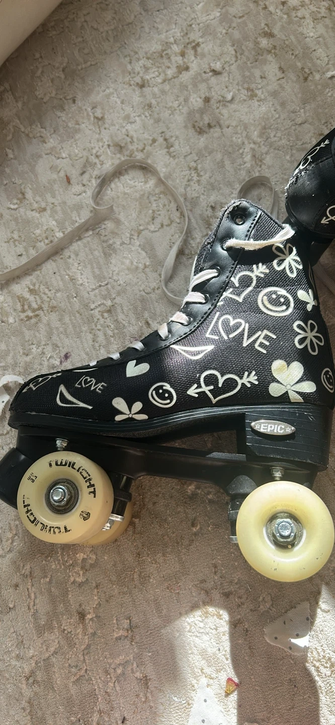 Selling a pair of Epic Skates roller skates in black with a cute 'Love' design! They're in good condition and ready for some fun at the roller rink or outdoors. Perfect for beginners or experienced skaters alike!