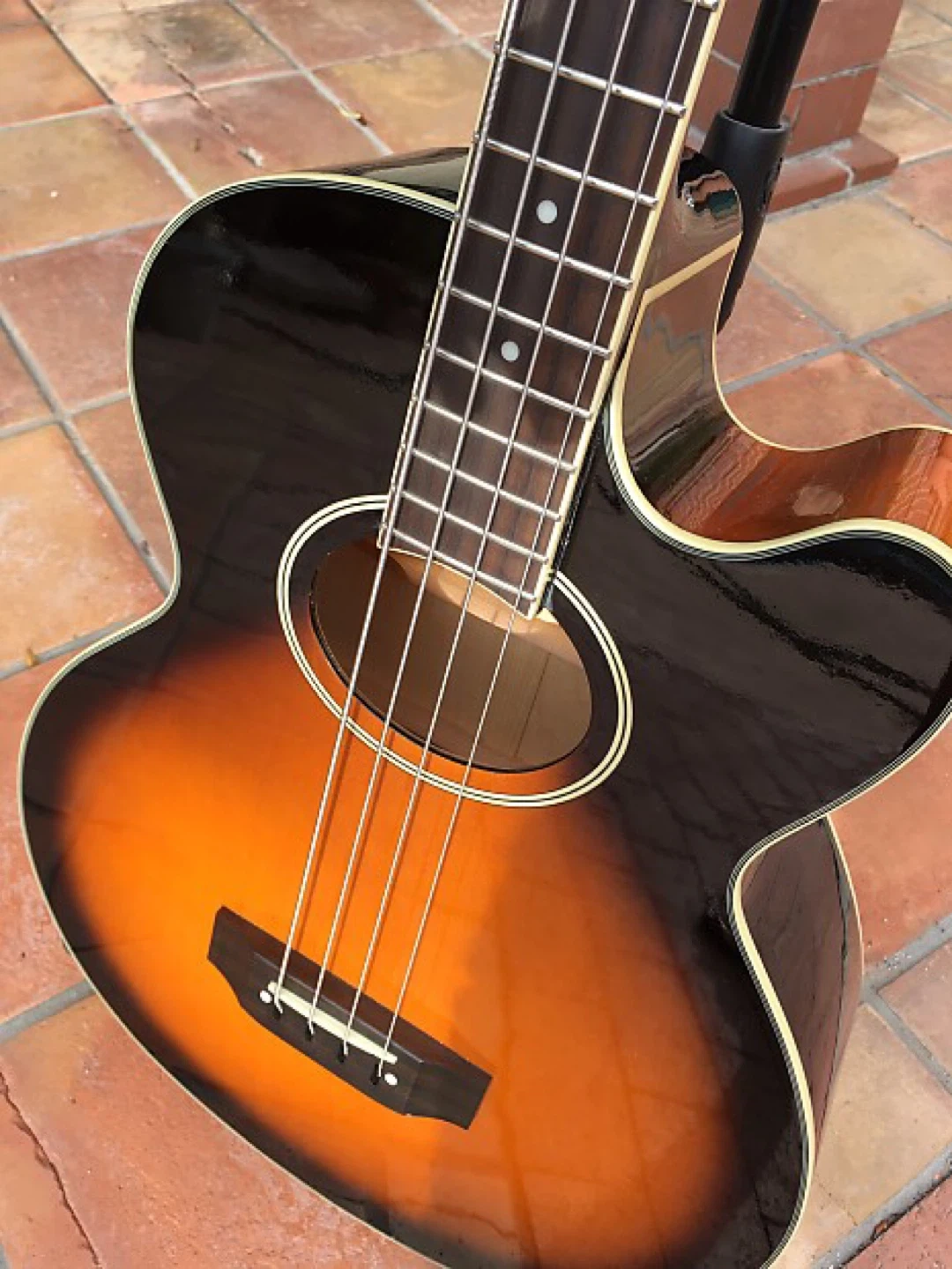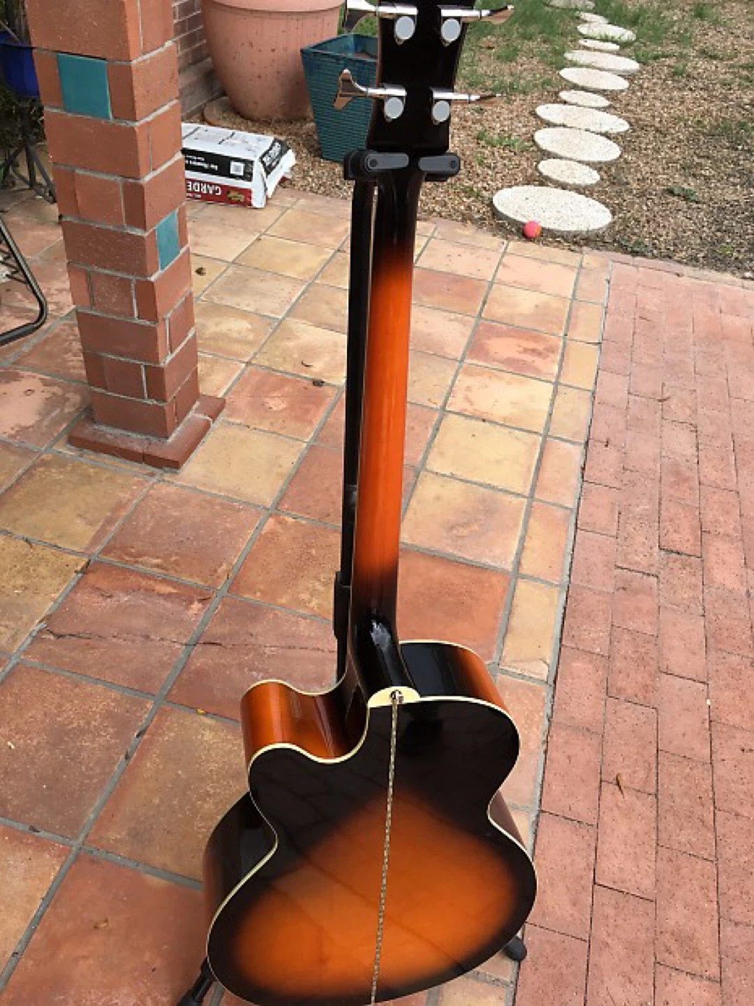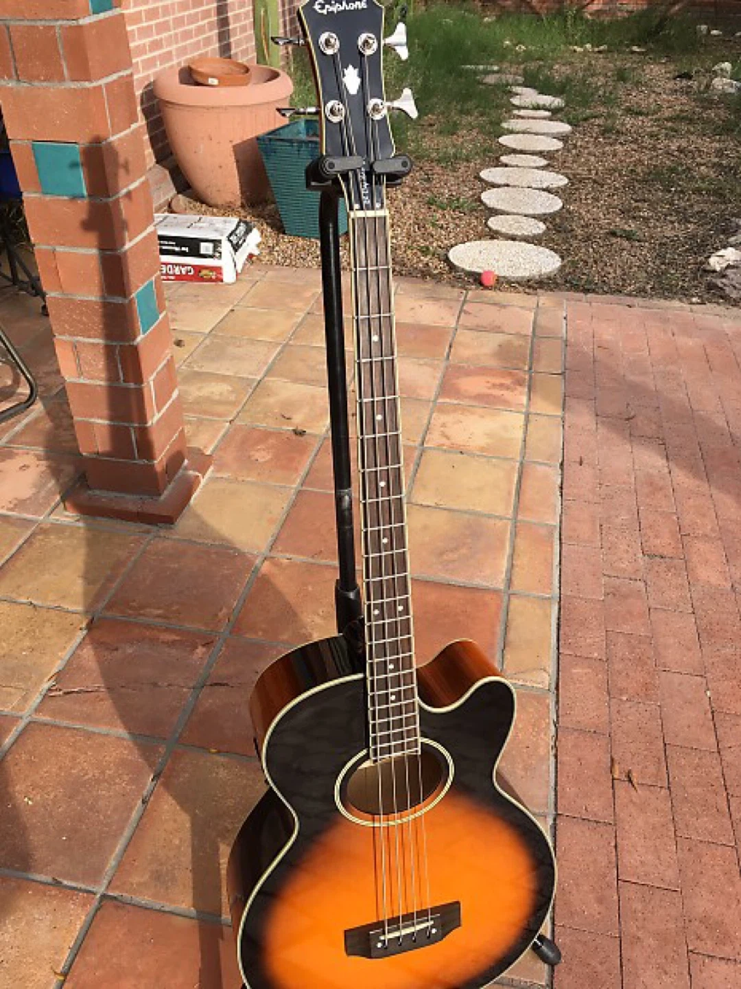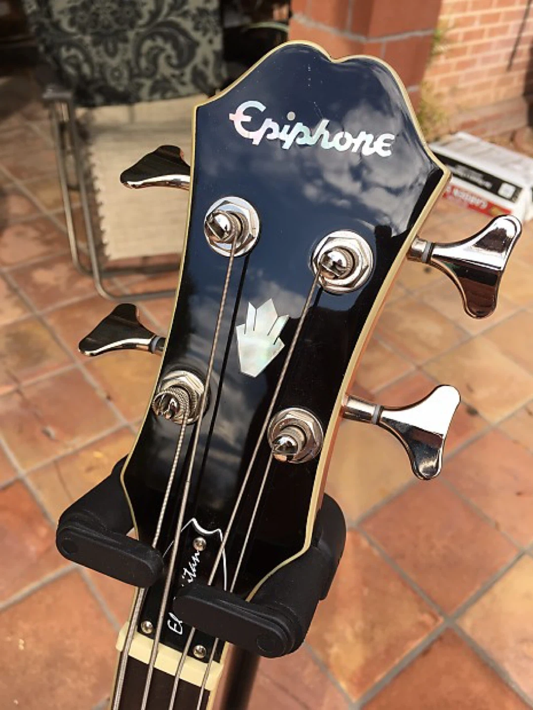 A great sounding bass and has been used on a lot of recordings - no scratches or dents, pristine condition and all stock. This El Capitan has a bound Maple body, 34 in. scale set Maple neck (and top), with a bound Rosewood fingerboard with dot inlays, 1.73 inch nut width, chrome hardware and a “Epiphonic-6 pickup” that provides great tone. Just needs a new pickup battery.