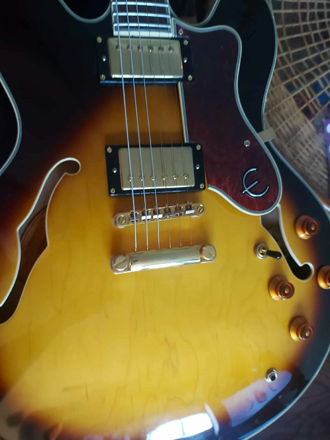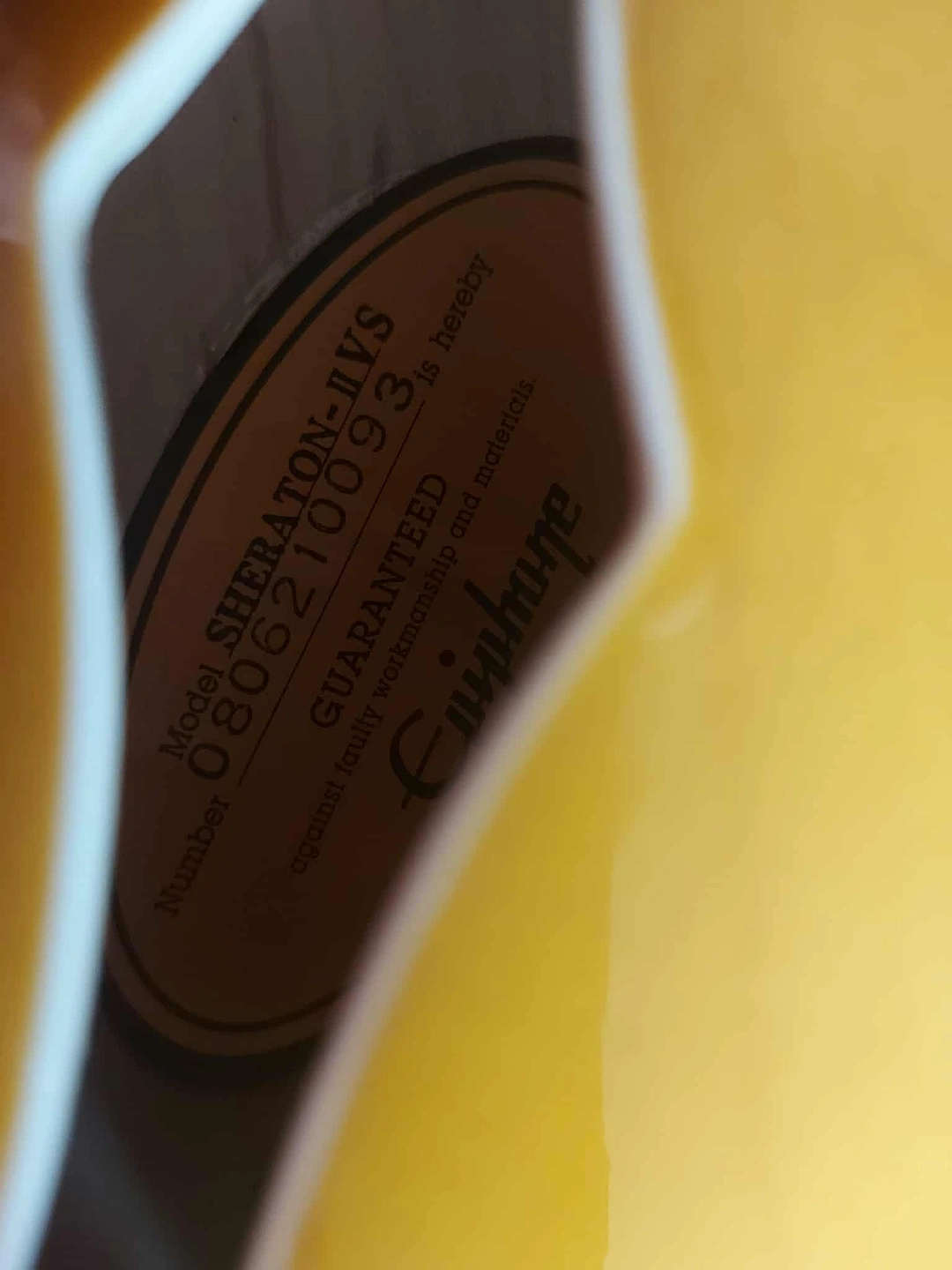 Selling an Epiphone Sheraton-II VS electric guitar, in Sunburst finish with pearl fretboard markers. It's in great shape and ready to play! The model number is 0806210093. A beautiful instrument for any guitarist. sounds great plugged in but can also play acoustic for fun. Inclides guitar case (hard body), strap for playing. As well I have a guitar amp {Marshall 12") & reverb peddle (see other ad, sold separately)