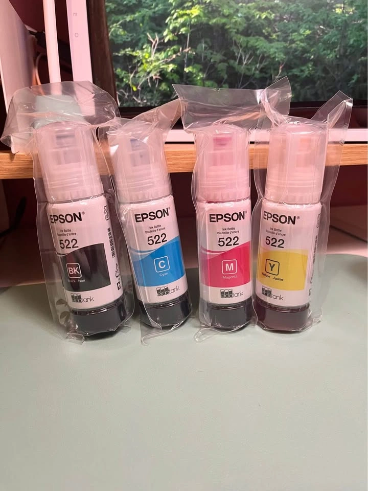 Brand new set of Epson 522 refill ink. Comes with black, cyan, magenta, and yellow.