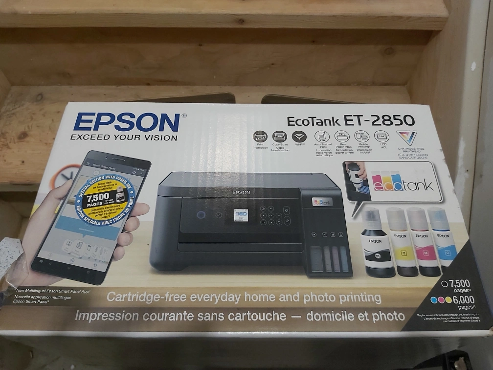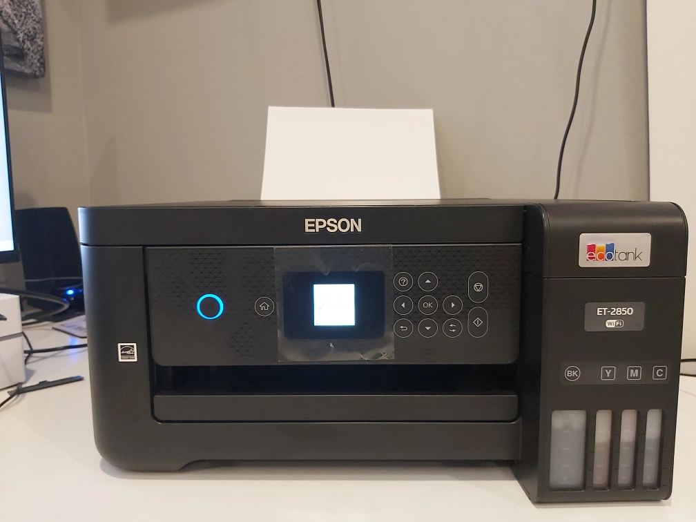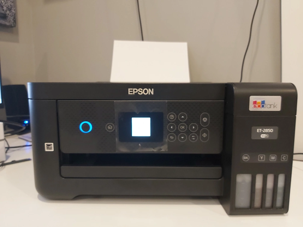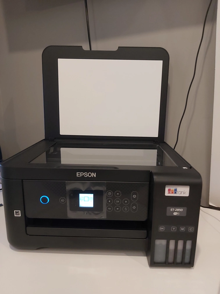 Epson EcoTank ET-2850 all-in-one printer. Includes all ink tanks. Cartridge-free printing. Wireless connectivity.