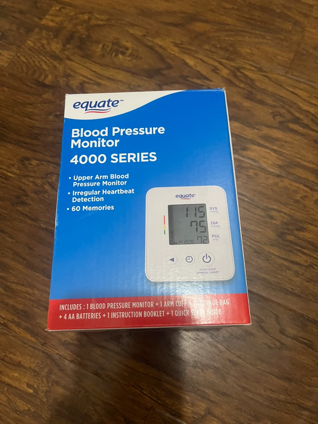 Selling an Equate 4000 Series Blood Pressure Monitor. It's new condition and comes in the box! Key features include: - Upper Arm Blood Pressure Monitor - Irregular Heartbeat Detection - 60 Memories It also includes 1 blood pressure monitor, 1 arm cuff, a storage bag, 4 AA batteries, 1 instruction booklet, and 1 quick start guide