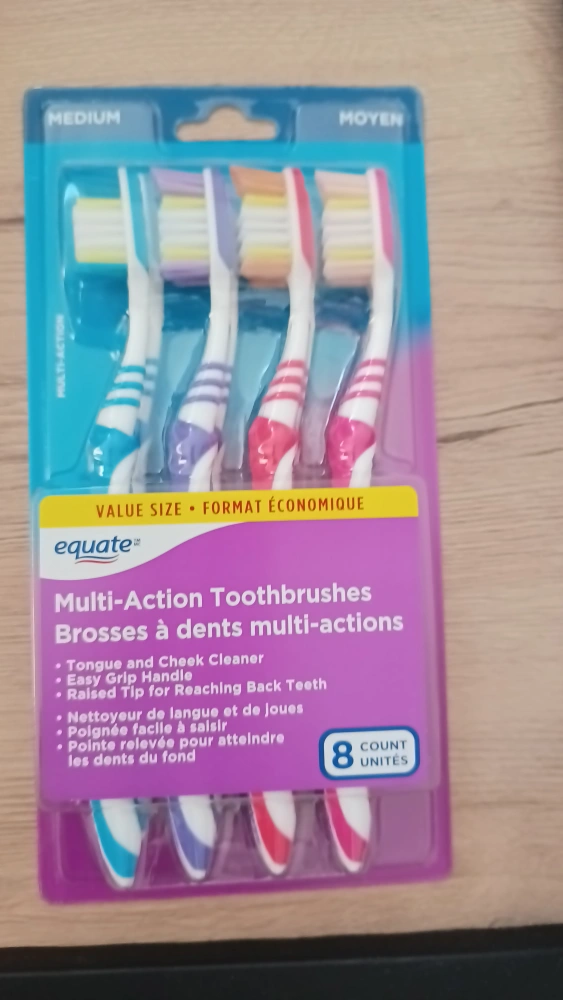 I'm selling a pack of Equate Multi-Action Toothbrushes. This is a value size pack that includes 8 toothbrushes. They have a tongue and cheek cleaner and an easy grip handle.
