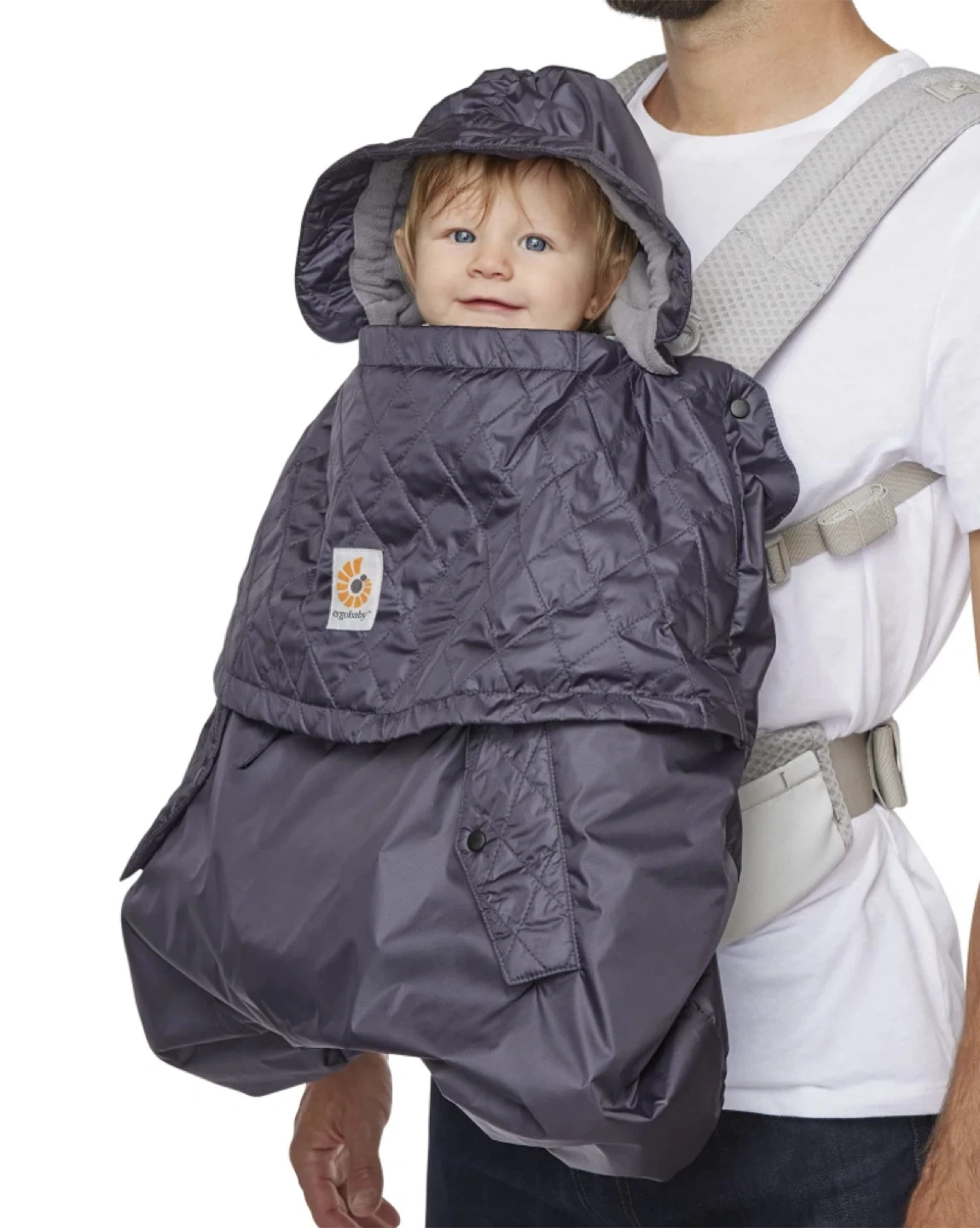 Gently used. Has been washed. Great addition to ergobaby carrier in cooler months. Hood + all snaps, elastics and pockets work perfectly. Note: Photos make the colour look more blue - true colour is grey. * Made with water-resistant, quilted outer shell and a soft, fleece-lined inner lining to keep baby warm and dry. Includes fleece-lined pockets for parents. * The removable hood provides warmth in versatile carry positions – Front-Inward, Front-Outward and Back Carry. Compatible with any Ergobaby carrier and most other branded carriers. * With easy-to-use snaps, you can quickly attach the cover to your carrier without needing the help of others. * Adjustable hood and adjustable foot area create the perfect fit for your baby. * Pack the cover into itself in a self-containing pocket under its quilted layer for compact storage.