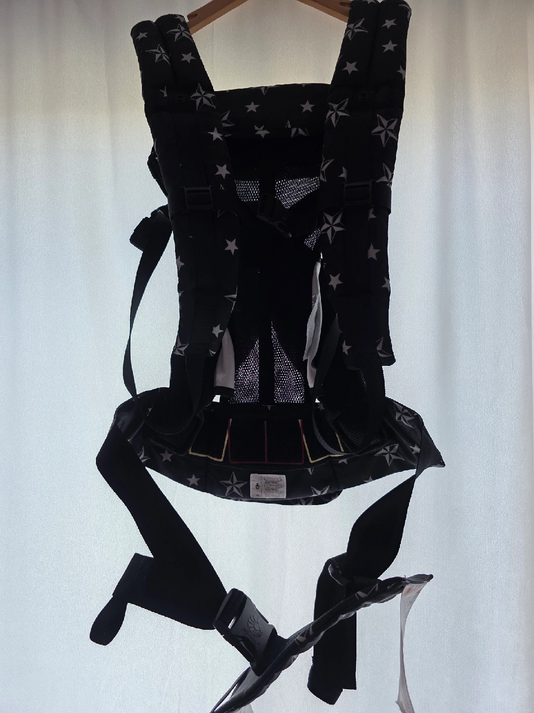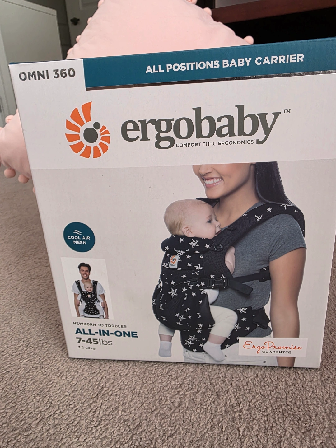 This is an Ergobaby Omni 360 baby carrier in great condition! It's black with a star pattern. The carrier supports all positions and is suitable for newborns to toddlers (7-45lbs or 3.2-20kg). It features a cool air mesh to keep your little one comfortable. The box is included!