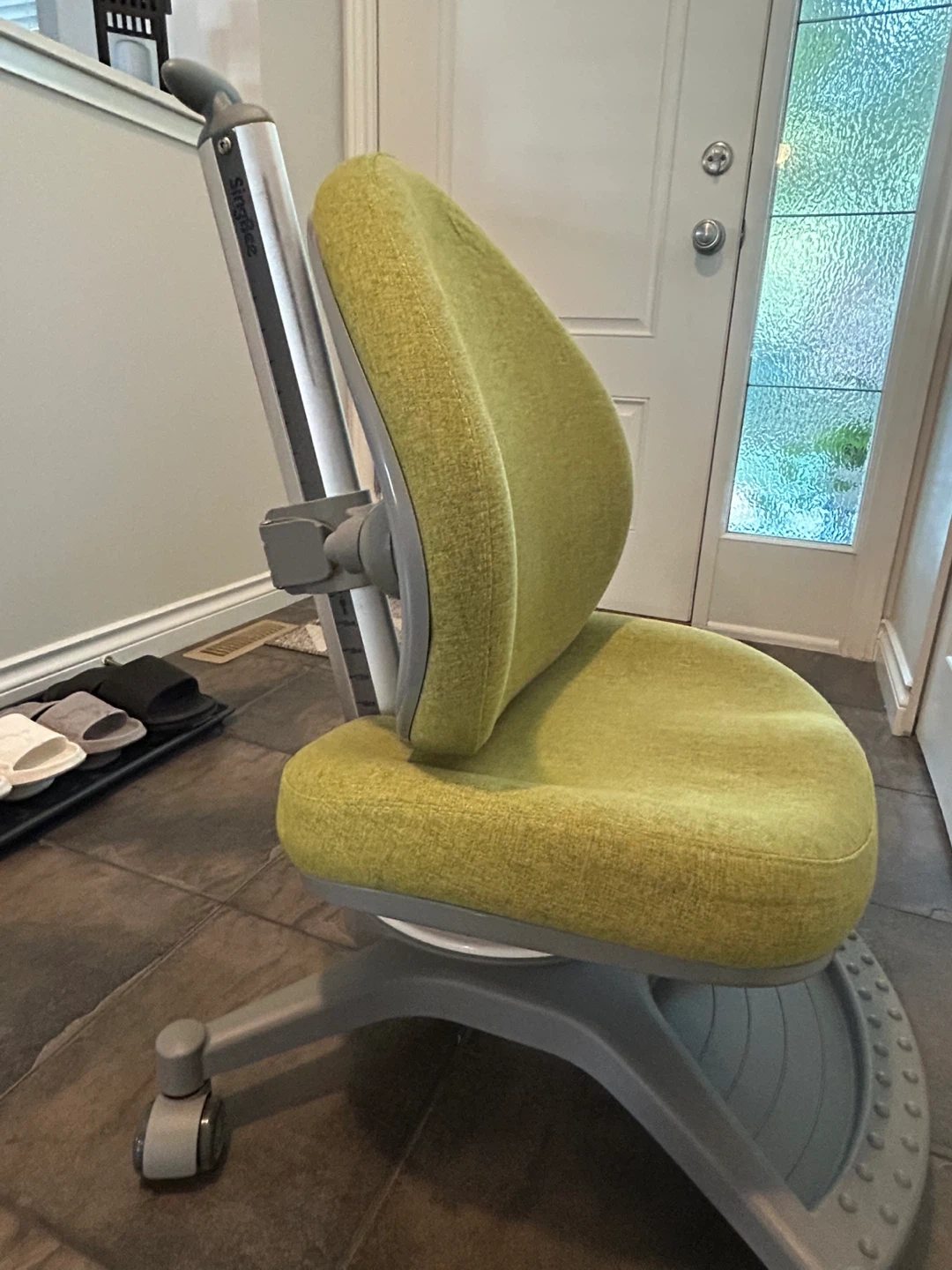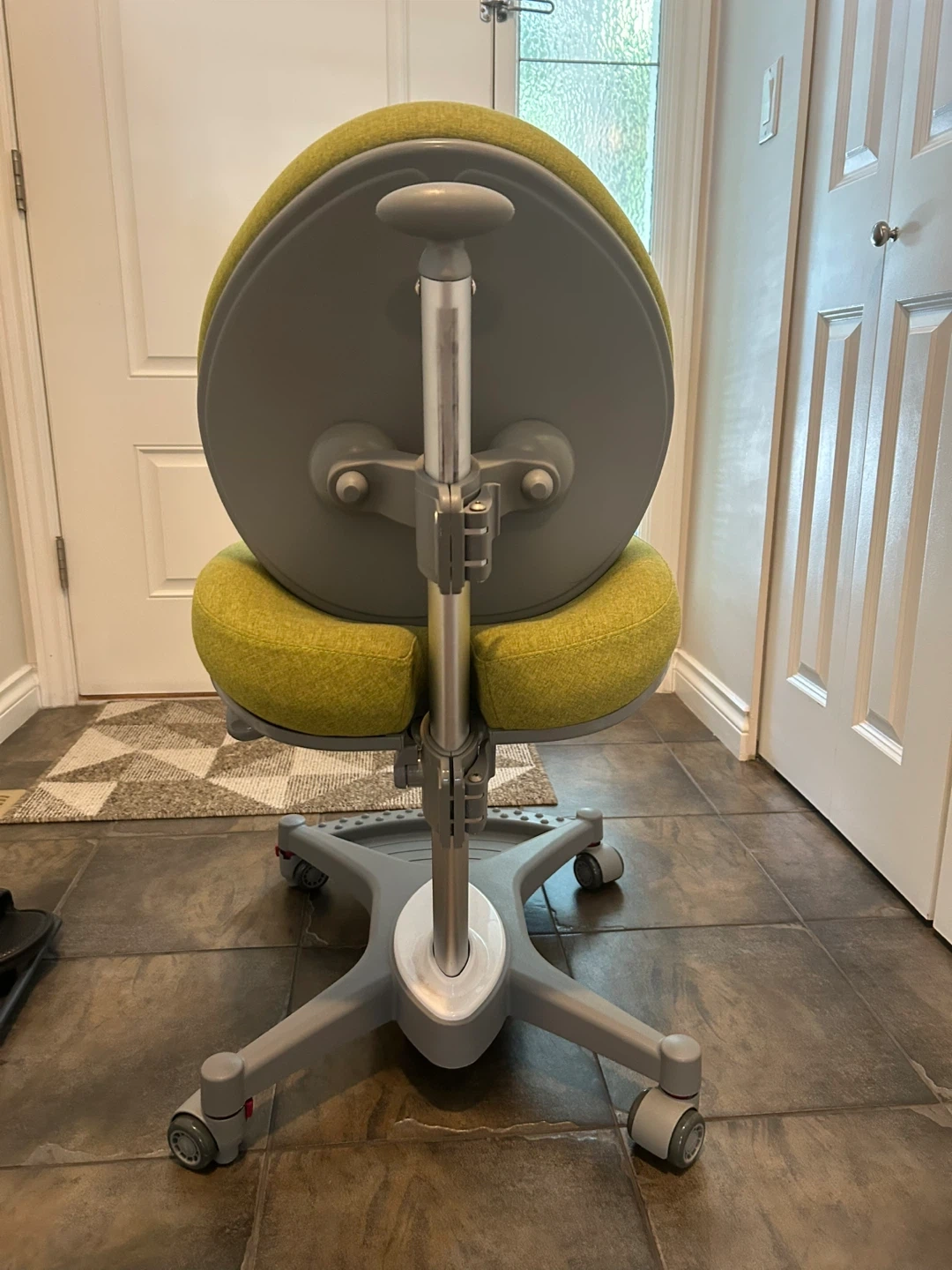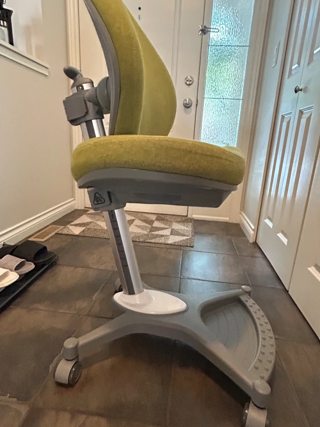 Selling an ergonomic kids study chair in excellent condition! It features a unique design to promote good posture and comfort for children while they study or work at their desks. The chair is adjustable to accommodate different heights, as shown on the height scale (120cm to 190cm). It also has a sturdy base with smooth-rolling casters for easy movement with lockable features.