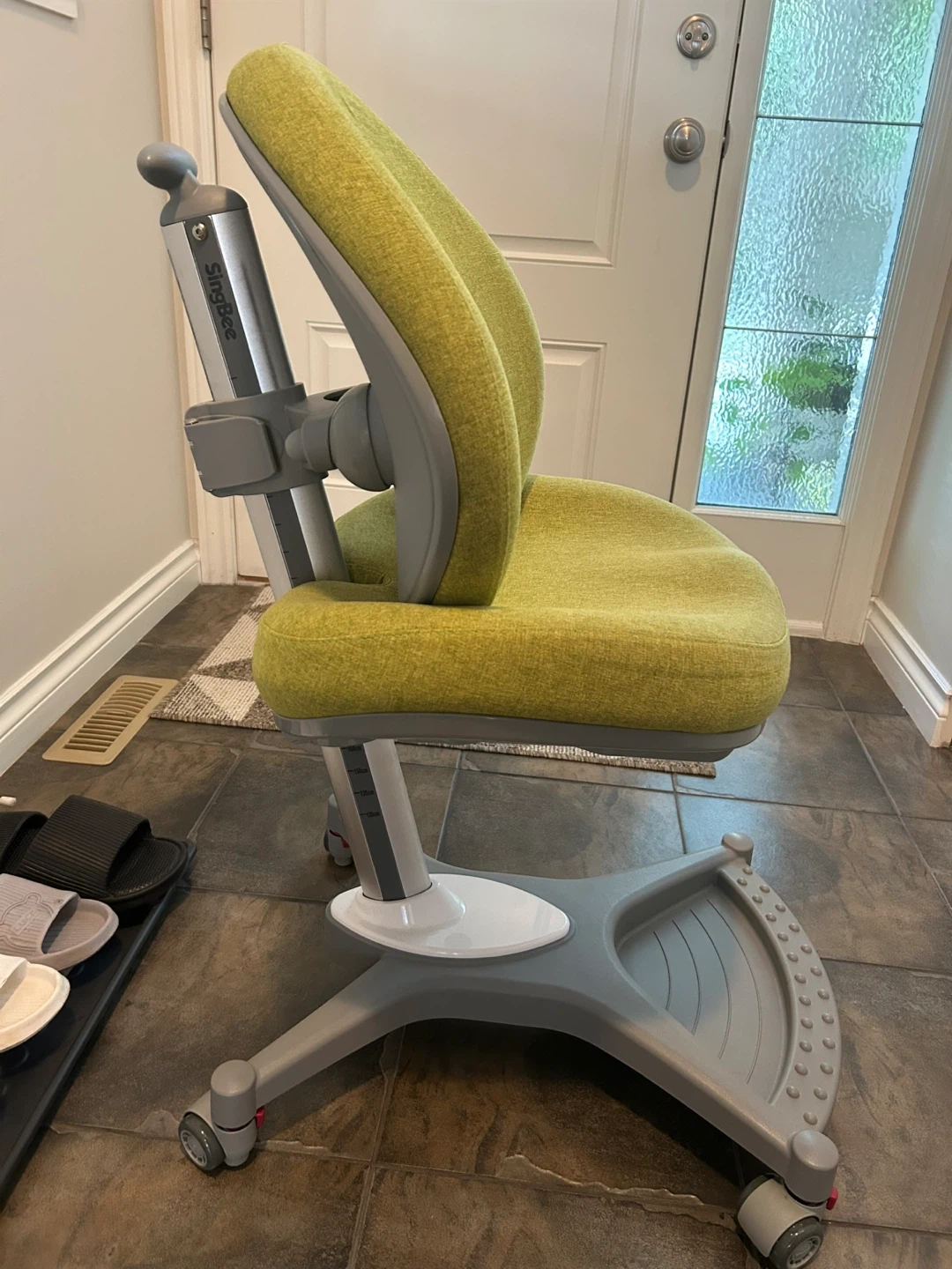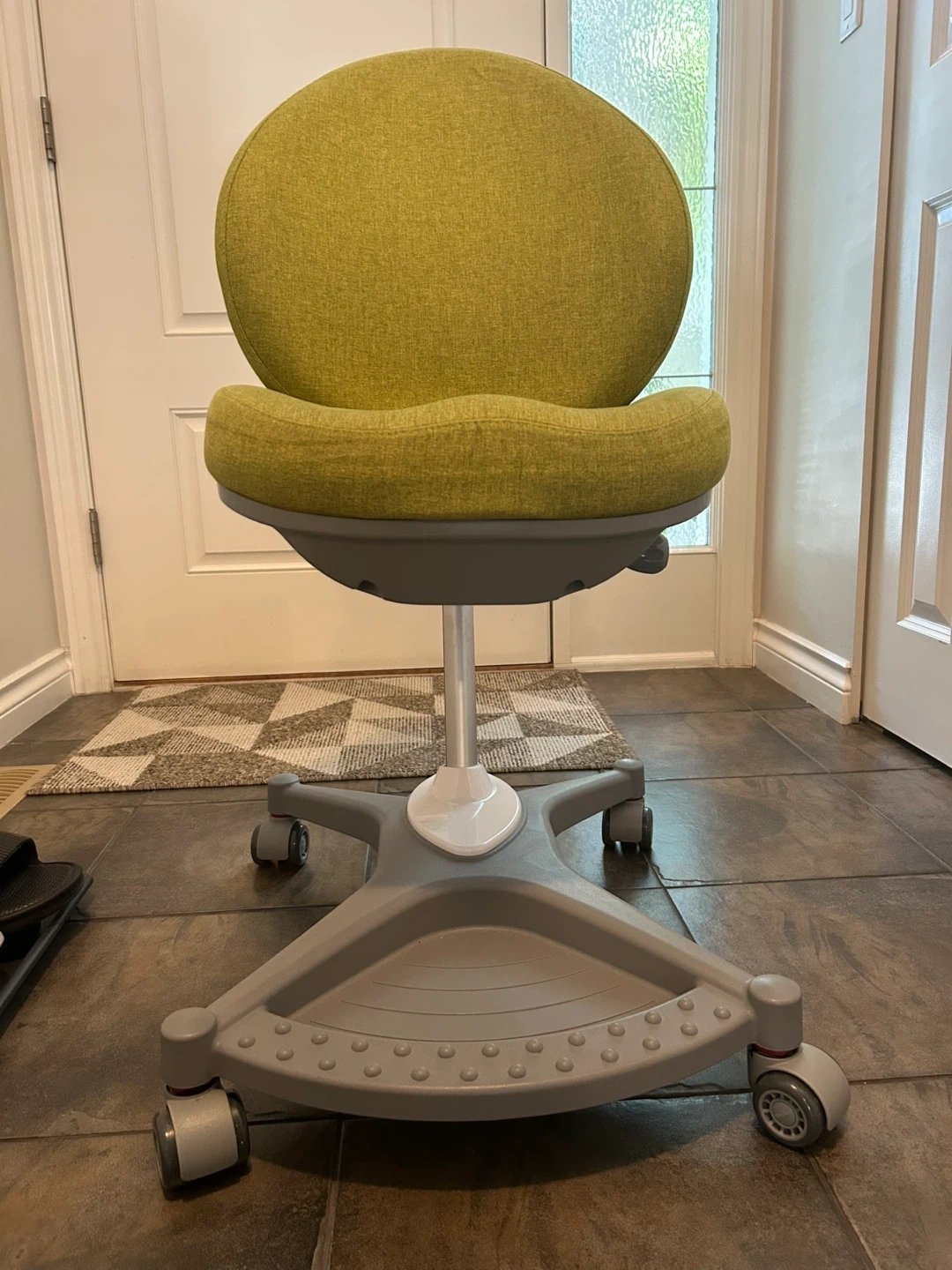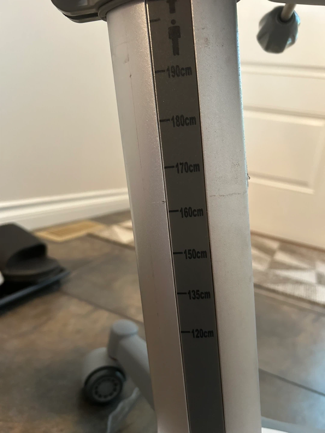 Selling an ergonomic kids study chair in excellent condition! It features a unique design to promote good posture and comfort for children while they study or work at their desks. The chair is adjustable to accommodate different heights, as shown on the height scale (120cm to 190cm). It also has a sturdy base with smooth-rolling casters for easy movement with lockable features.