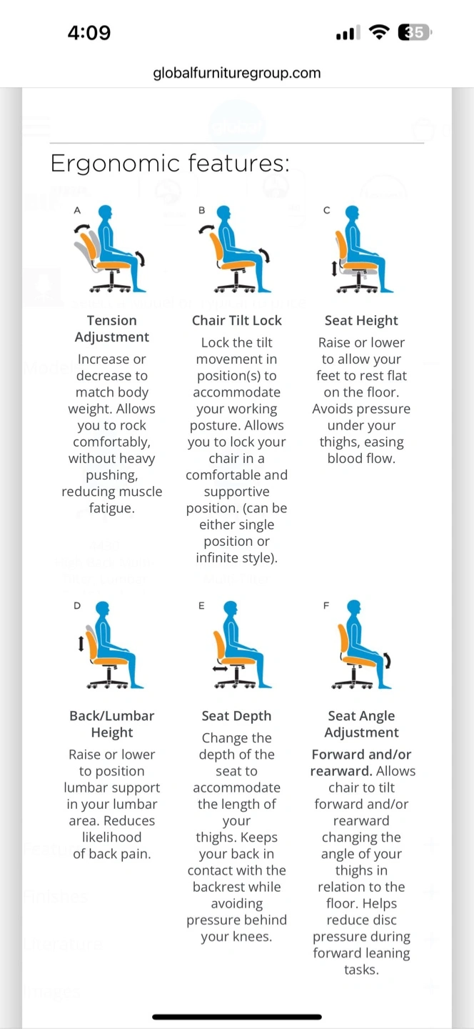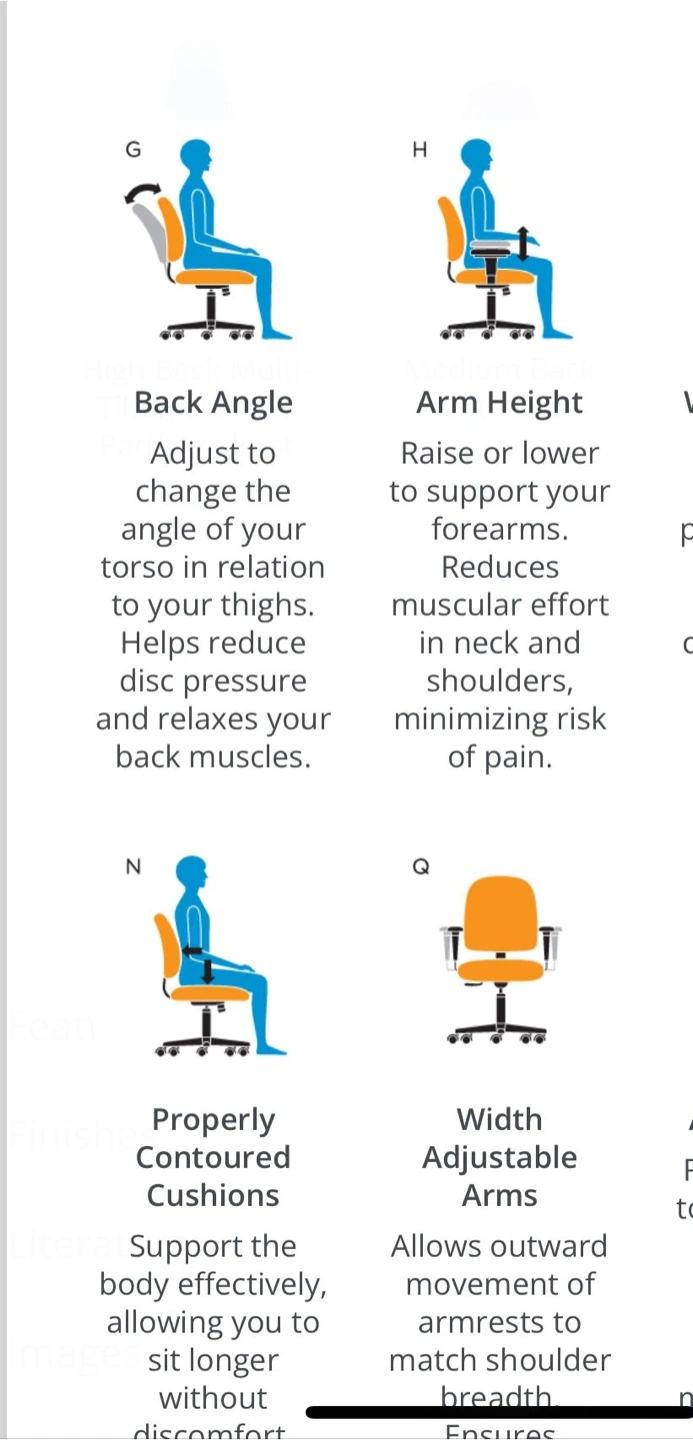 Ergonomic office chair is designed for comfort and support during long work hours! It features: - Adjustable back angle to change the angle of your torso in relation to your thighs, helping reduce disc pressure and relax your back muscles - Adjustable arm height to raise or lower to support your forearms, reducing muscular effort in the neck and shoulders and minimizing the risk of pain - Properly contoured cushions to support the body effectively, allowing you to sit longer without discomfort - Width adjustable arms to allow outward movement of armrests to match shoulder breadth - Tension adjustment to increase or decrease to match body weight, allowing you to rock comfortably without heavy pushing, reducing muscle fatigue - Chair tilt lock to lock the tilt movement in position(s) to accommodate your working posture - Seat height adjustment to raise or lower to allow your feet to rest flat on the floor - Back/lumbar height adjustment to raise or lower to position lumbar support in your lumbar area - Seat depth adjustment to change the depth of the seat to accommodate the length of your thighs - Seat angle adjustment forward and/or rearward to allow chair to tilt forward and/or rearward, changing the angle of your thighs in relation to the floor