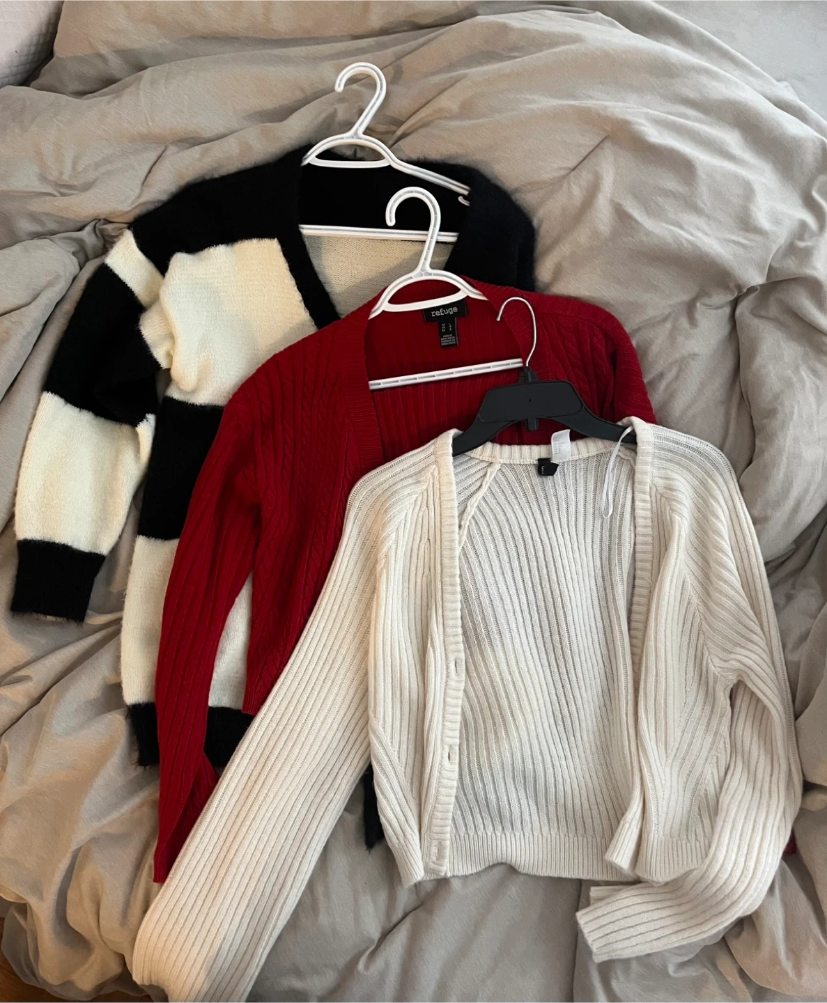 Black and White Cardigan - oversize fits Small- Large . Red - Size tag is Large but runs small. Fits Small to Large frame. White - H&M size Small. Fits Small to Medium. All 3 for $60 . No delivery. Just meet up or pick up.