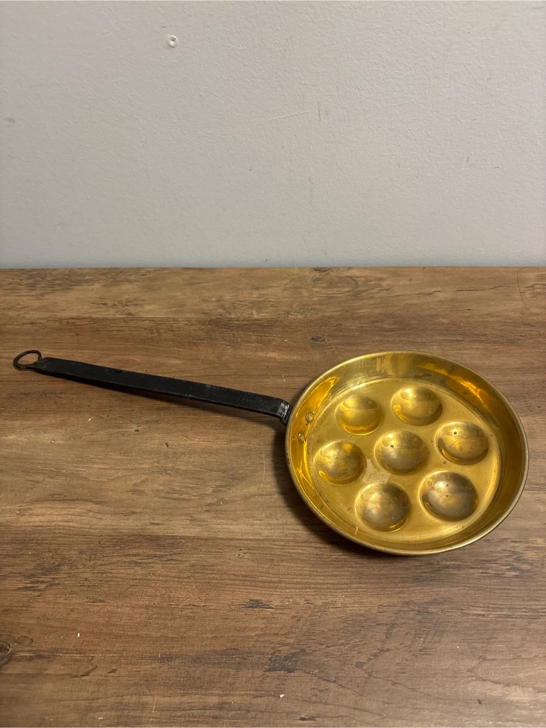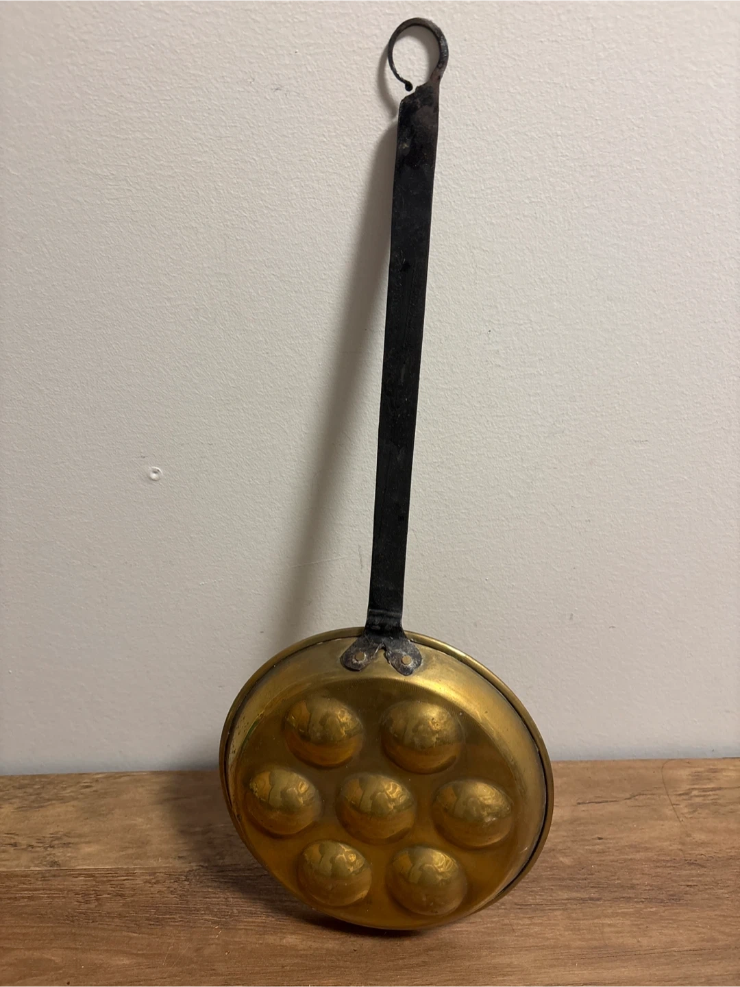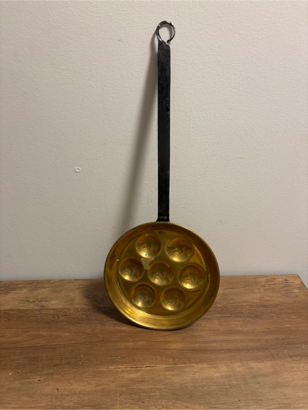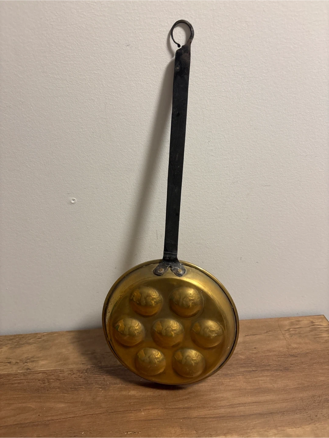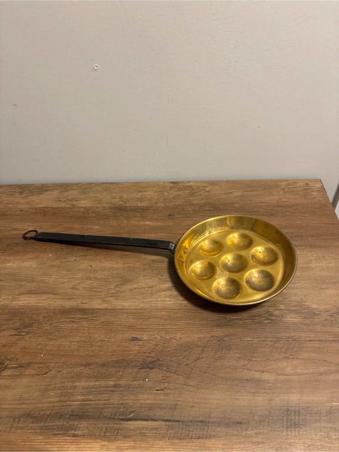 Selling a brass escargot pan! It has 7 wells for preparing those delicious snails. It has a long black handle for easy maneuvering. It's in good condition and ready for a new home!