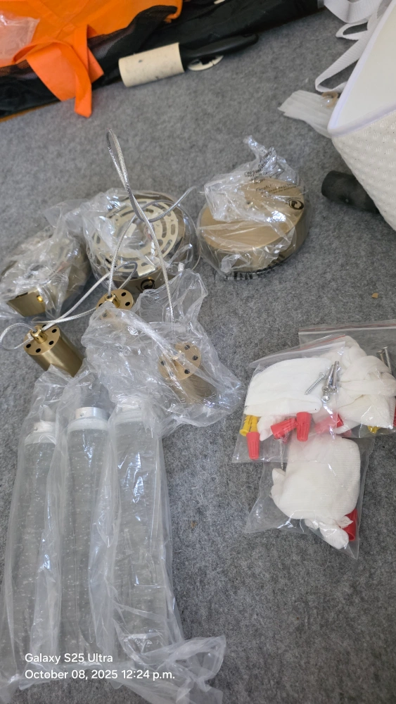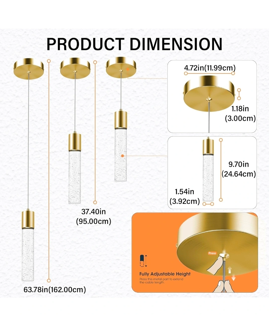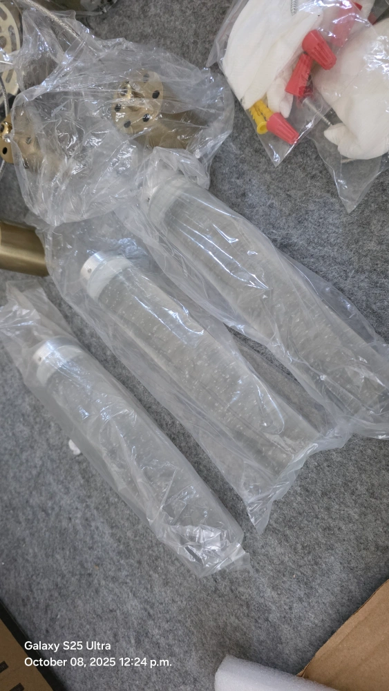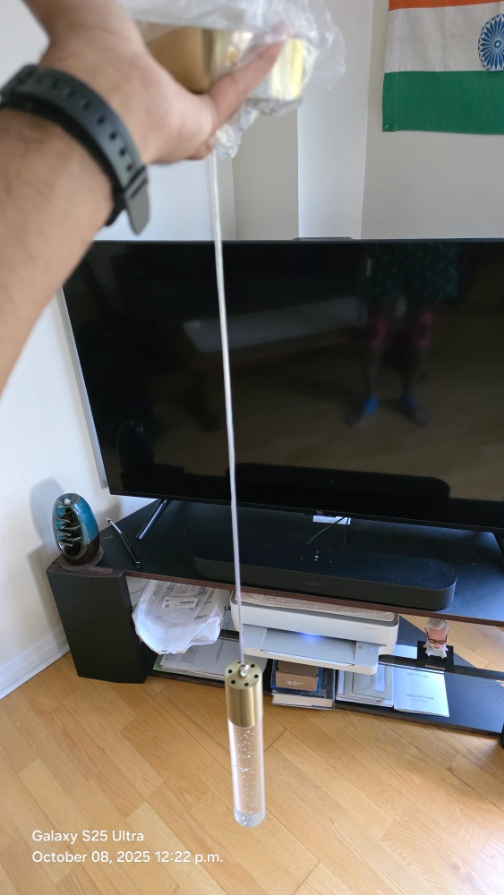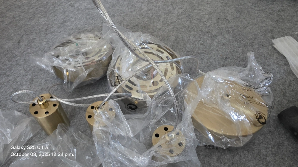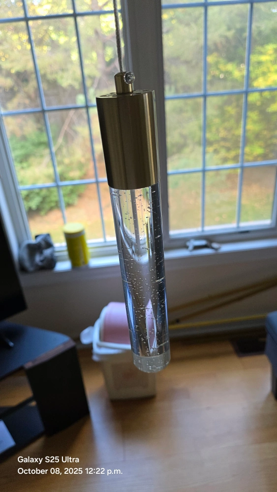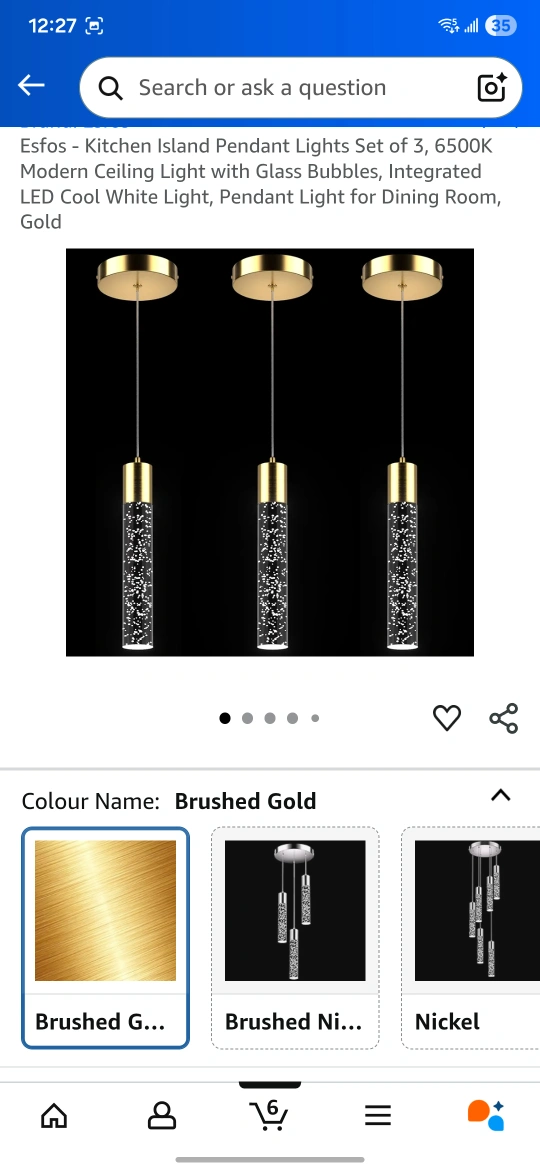 Selling a set of 3 Esfos kitchen island pendant lights in brushed gold! These modern ceiling lights feature glass bubbles and integrated LED cool white light. Perfect for adding a touch of elegance to your dining room or kitchen island. They are still in their original packaging