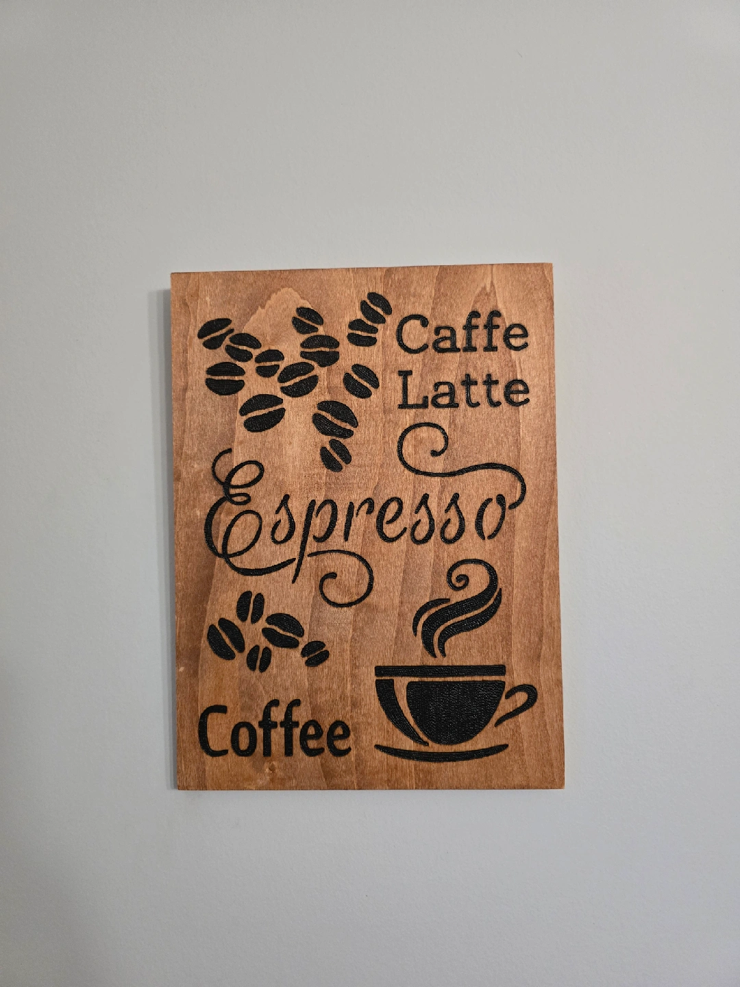 Add a touch of coffee shop charm to your kitchen or dining area with this cute wooden sign! It features coffee beans, a coffee cup, and the words 'Caffe Latte, Espresso, Coffee' in a stylish font. Handcrafted, handburnt on a 9x12" wood canvas. stained in traditional cherry. Free delivery within Calgary SE/NE and Chestermere.