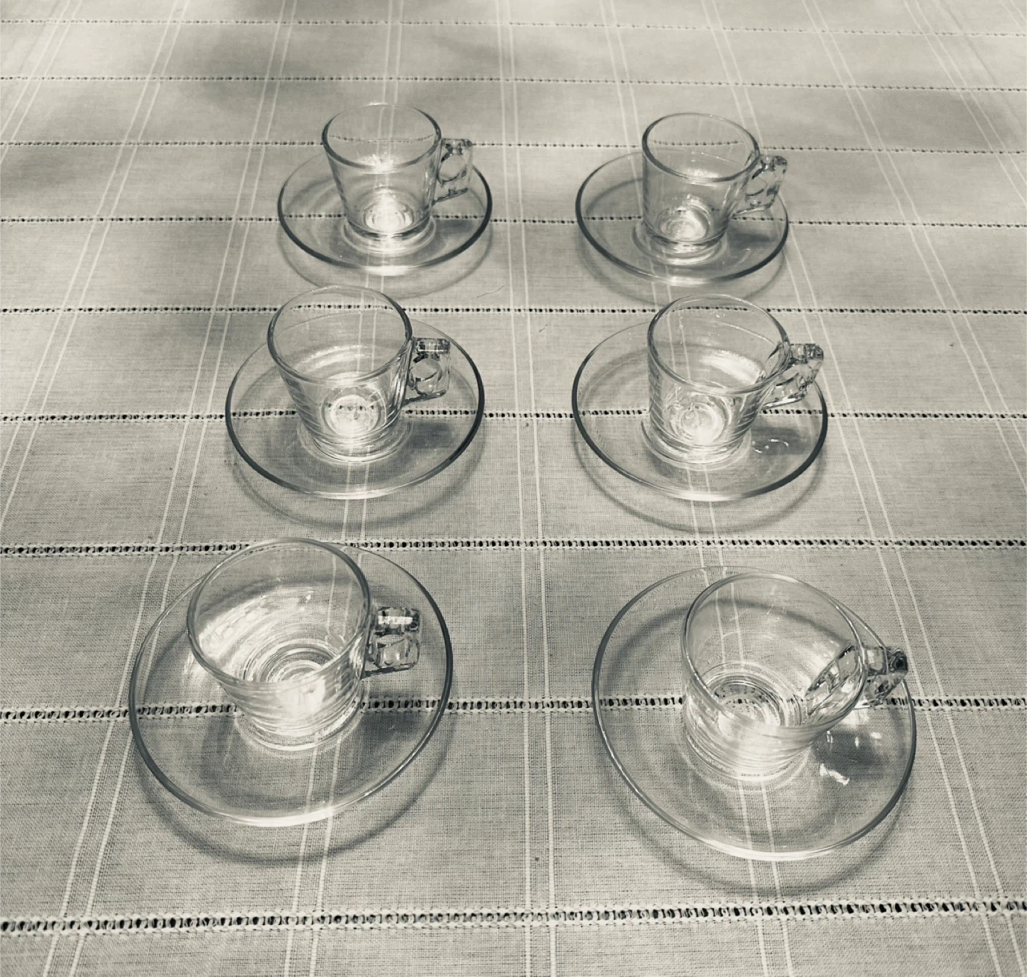 Selling a set of six clear glass espresso cups and saucers. They are brand new and never used. Perfect for enjoying your favourite espresso at home. They have a modern, minimalist design.
