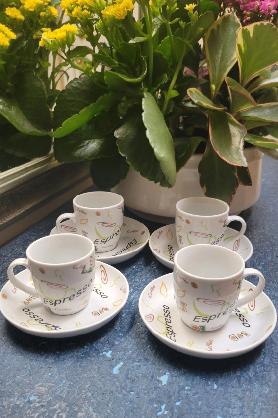 Selling a set of four espresso cups with matching saucers! They're white with cute little coffee-themed designs and the word "Espresso" printed on them. Perfect for your morning pick-me-up or a cozy chat with friends over coffee. All are in excellent condition edition, no cracks, no chips.