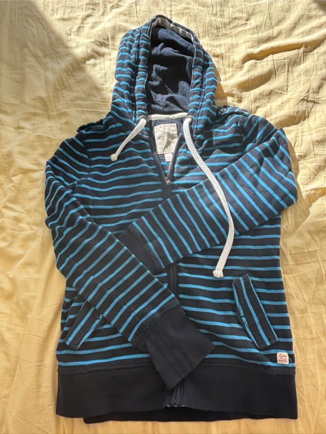 Here's a cozy Esprit zip-up hoodie! It features a stylish striped pattern in black and blue, perfect for layering. It's in great condition and ready for a new home. This hoodie has a full zipper, drawstring hood, and front pockets for added convenience. It's a versatile piece that can be dressed up or down!