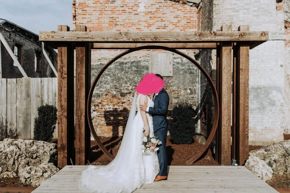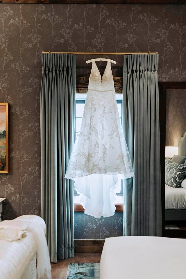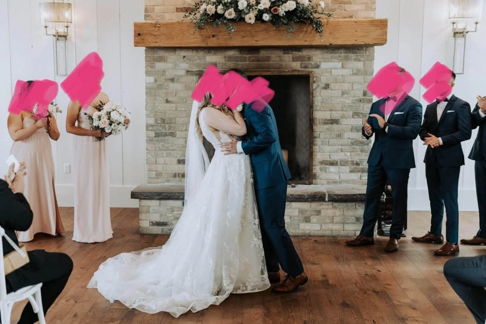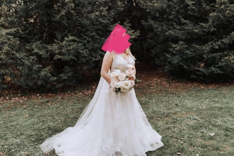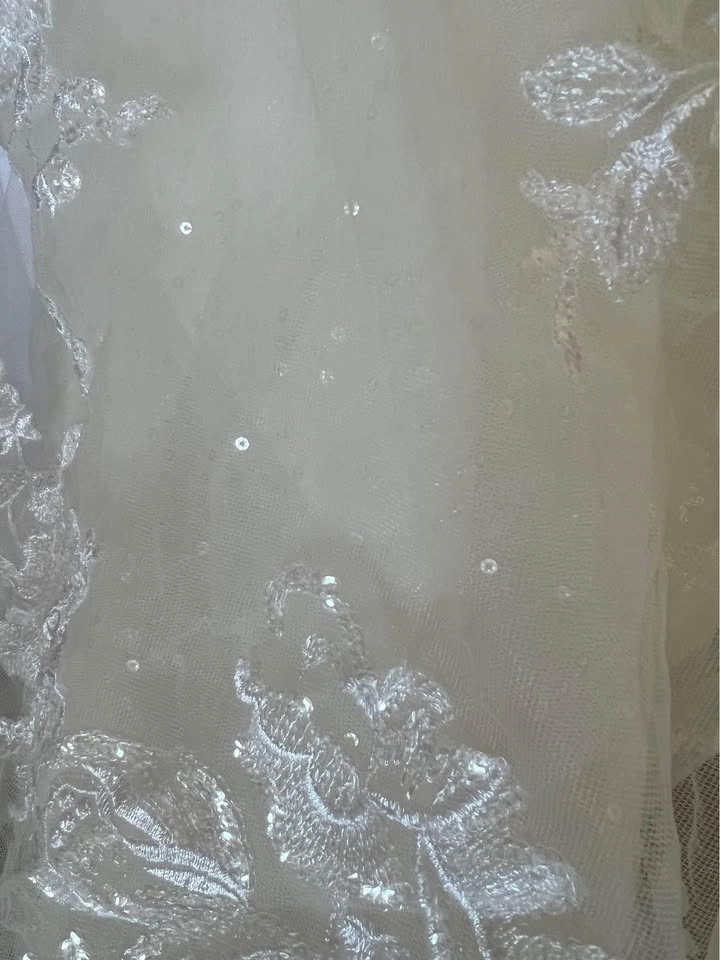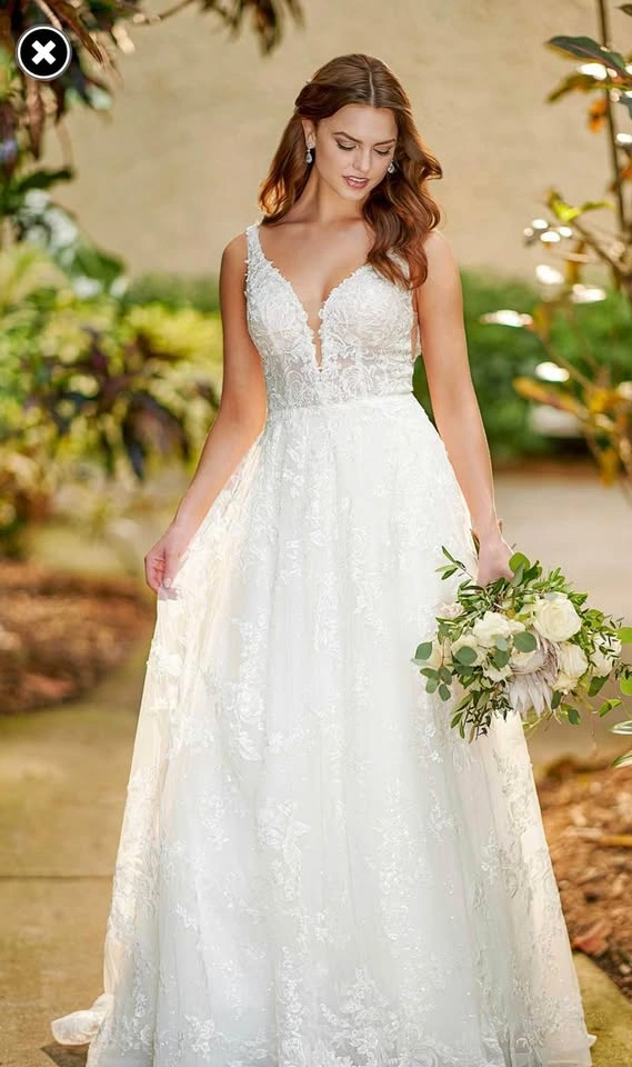 Absolutely stunning Essence of Australia wedding dress in the style D3127. A-line dress with a plunging neckline and ivory tulle skirt that has a gorgeous sparkle sequin detail in it (see photos). Purchased for $2,300+tax at Avenue 22 Bridal and worn once for my wedding - in excellent condition. I have already had it professionally cleaned at Trade Carriage Cleaners (costs $250+). Size 14. $250 matching Essence of Australia belt has been added and sewn on. The dress has been hemmed (I am 5’4 for height reference and wore 3” heels on my wedding day) and a bustle has already been added for a reception. Serious inquiries only.