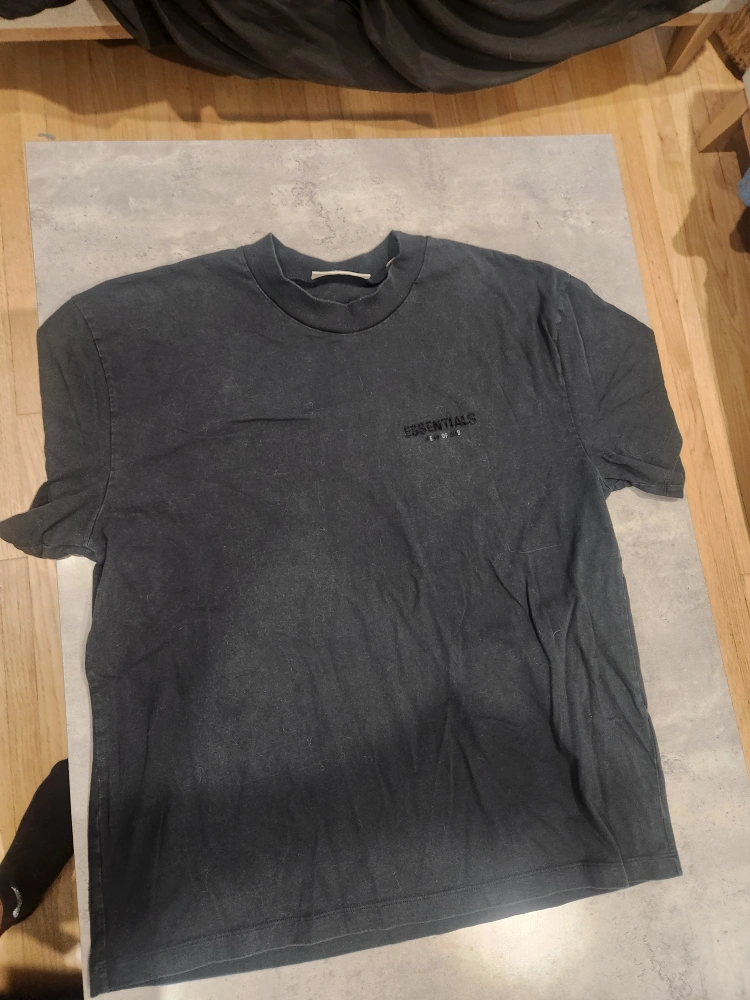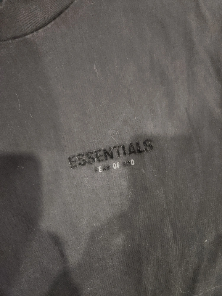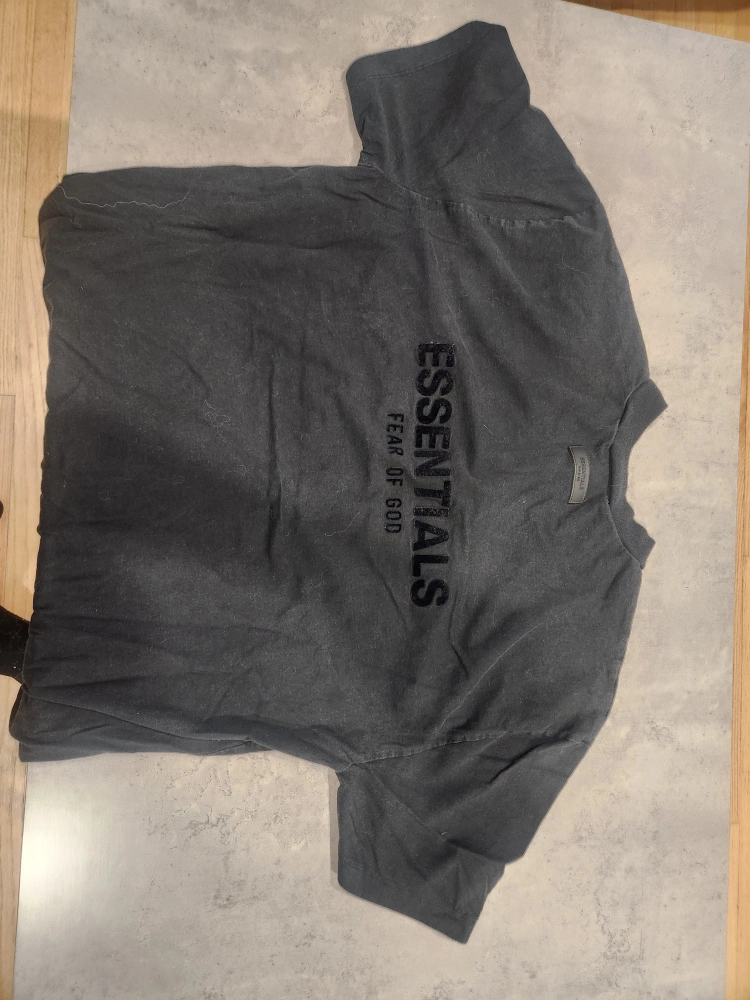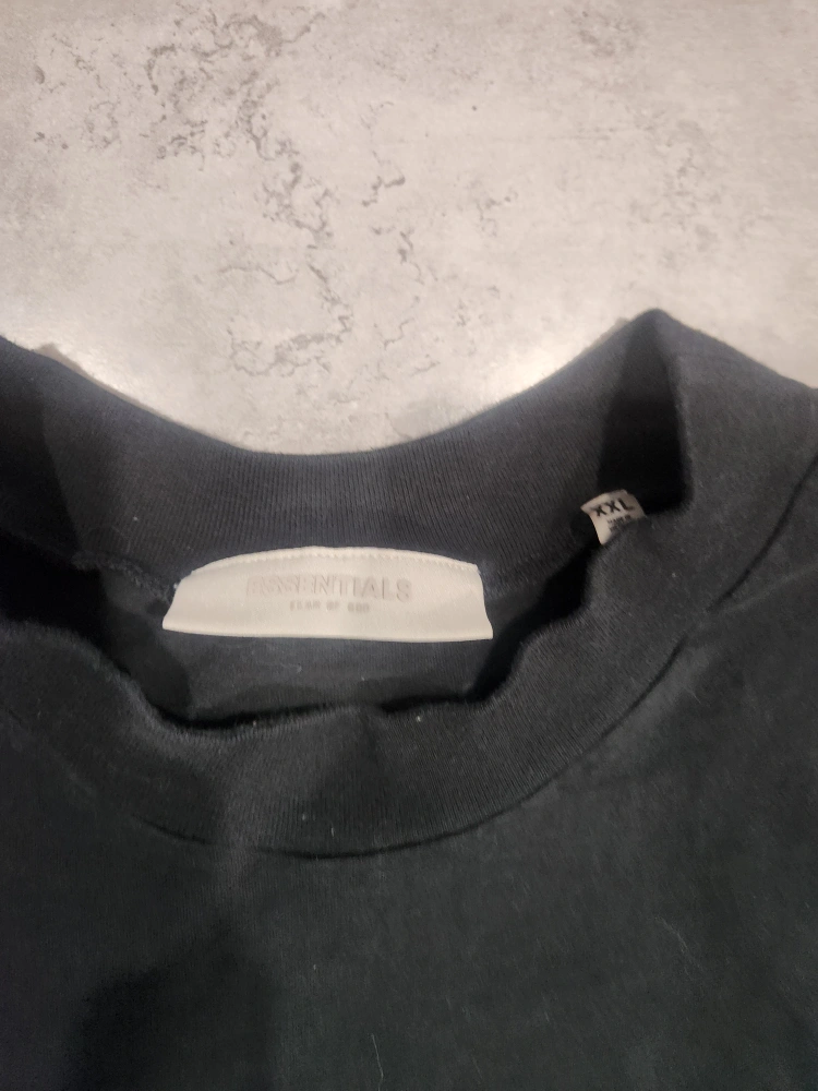 Selling an Essentials Fear of God t-shirt in size XXL. It's a stylish black tee with the brand's logo subtly displayed. This shirt is in great condition and ready for a new home! 3 letters have faded slightly still great shirt