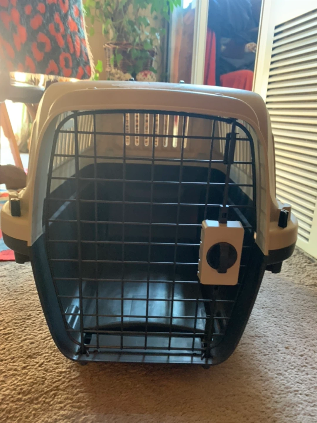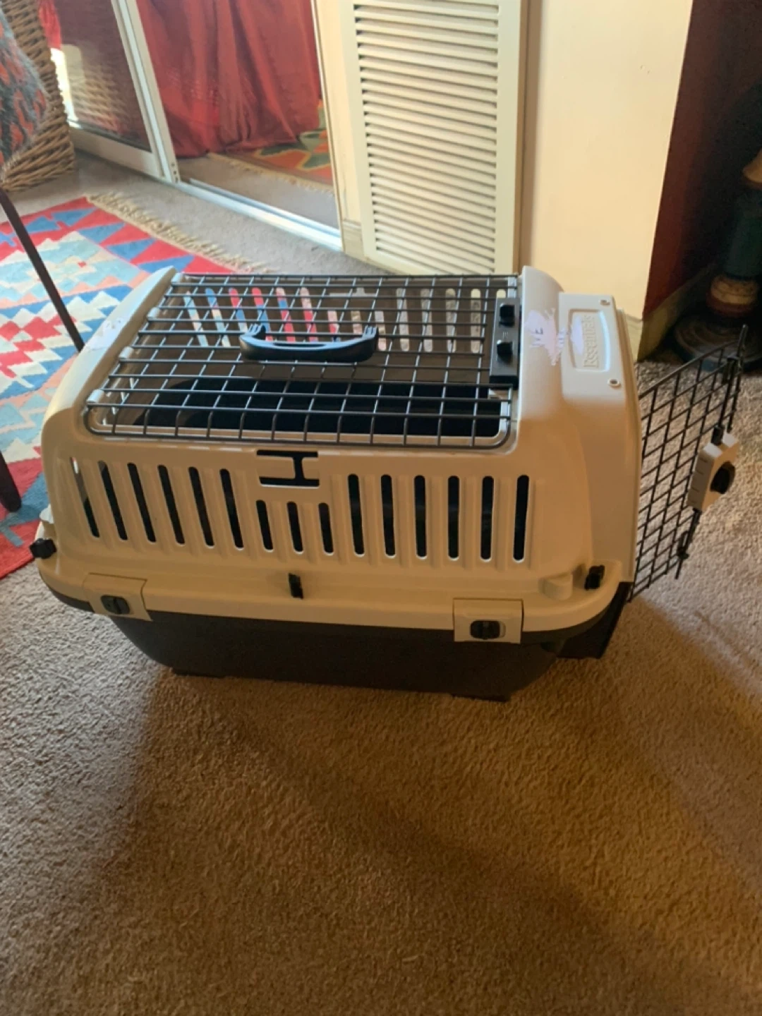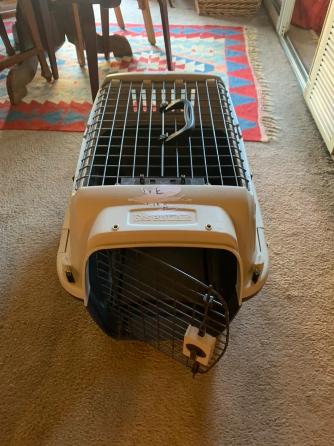 Essentials pet carrier in good condition! Perfect for vet visits or travel. Dimensions are approximately 24" x 16" x 16". USED ONCE. Just a sticker was placed on it and can be taken off. Full description in the photos.