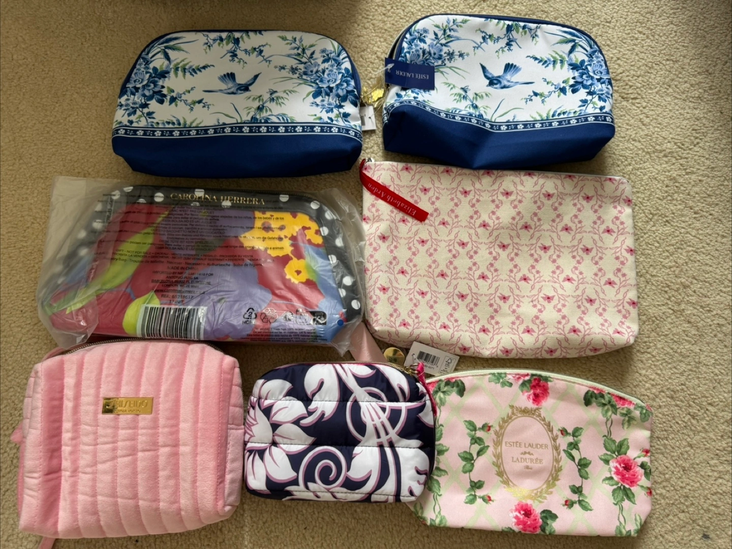 I have a selection of new Estee Lauder cosmetic bags available. They come in a variety of colours and designs. Perfect for travel or everyday use to keep your makeup organized! $5 each , $8/2 . $10/3 .