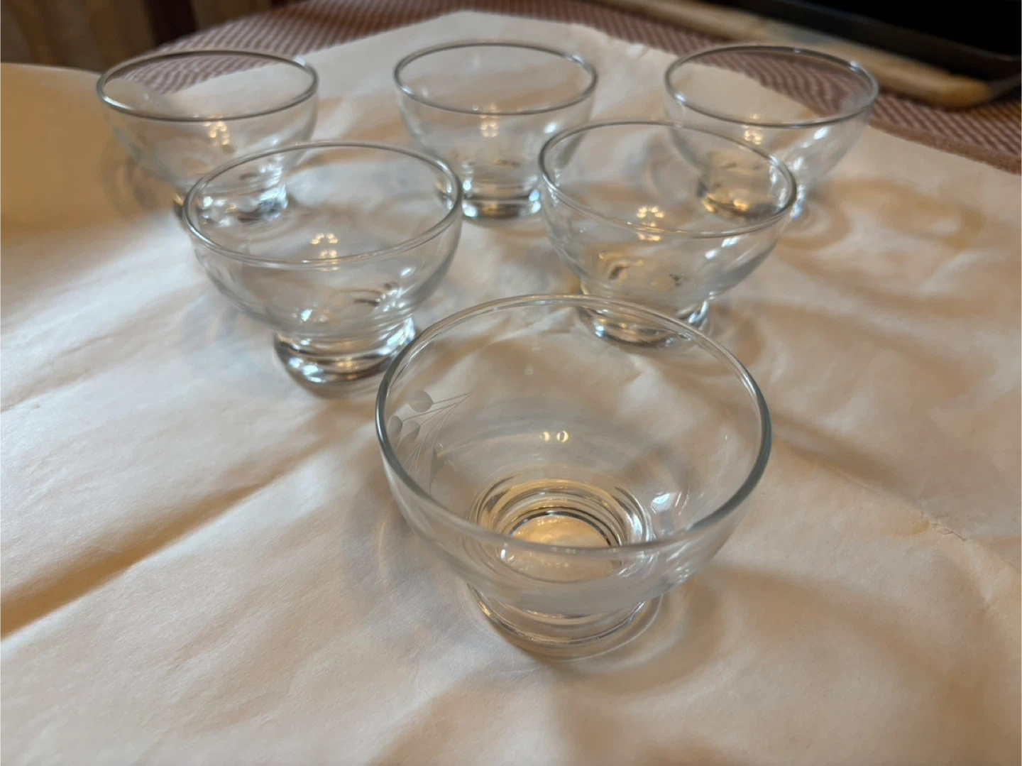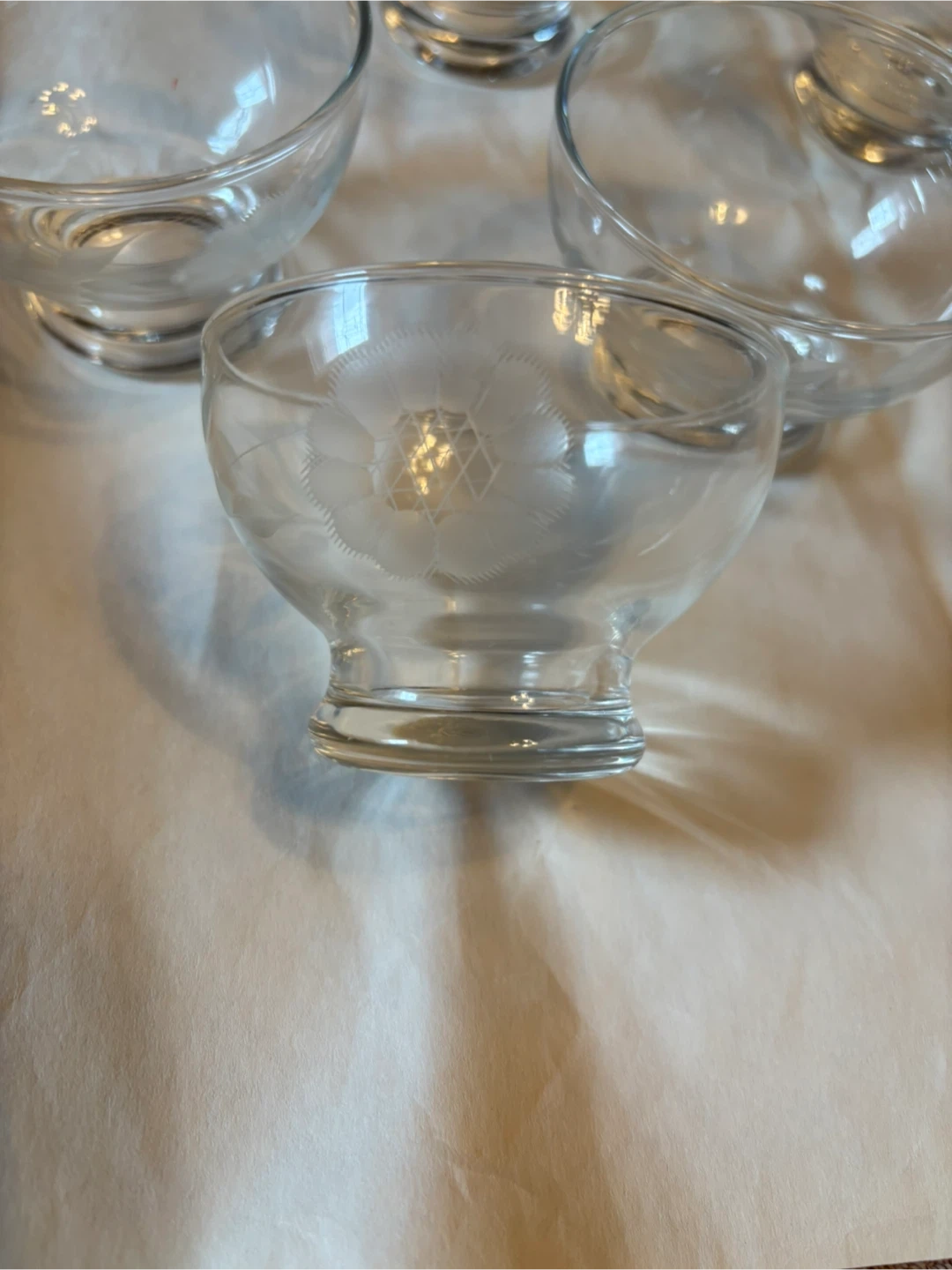 Selling a set of 6 Cornflower etched glass dessert bowls. They are in great condition and perfect for serving ice cream or other desserts! The etched floral design adds a touch of elegance to any table setting