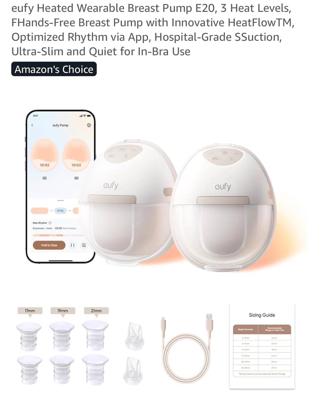 Selling a Eufy Heated Wearable Breast Pump E20. It features 3 heat levels and hands-free operation with innovative HeatFlowTM. It's optimized with an app and offers hospital-grade suction. It is ultra-slim and quiet for in-bra use. Unused, brand new in sealed box