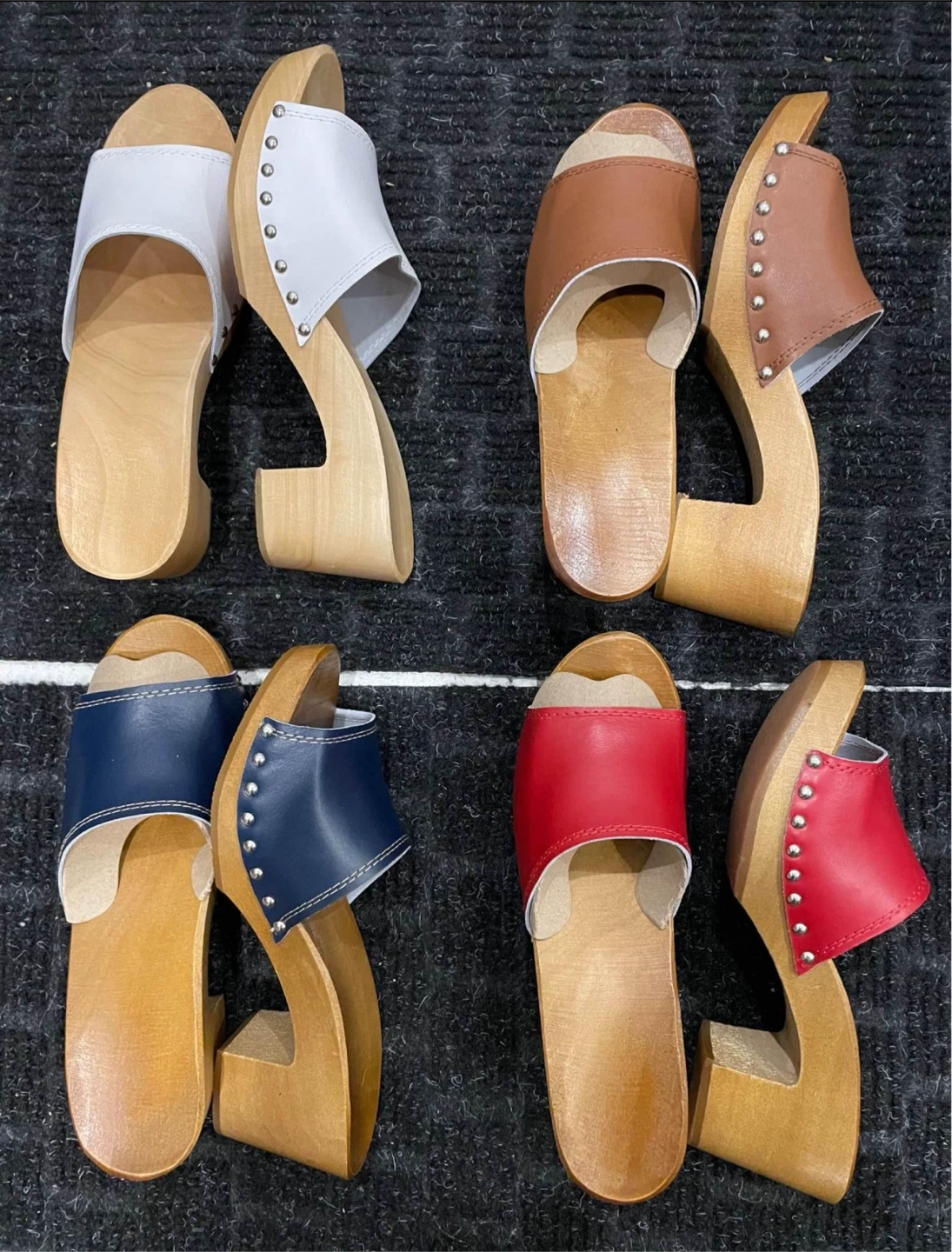 I have a few pairs of these fun wooden clogs available. They come in white, brown, blue, and red! They have a unique wooden sole and are in great condition. Perfect for adding a bit of retro flair to your wardrobe! $50 each